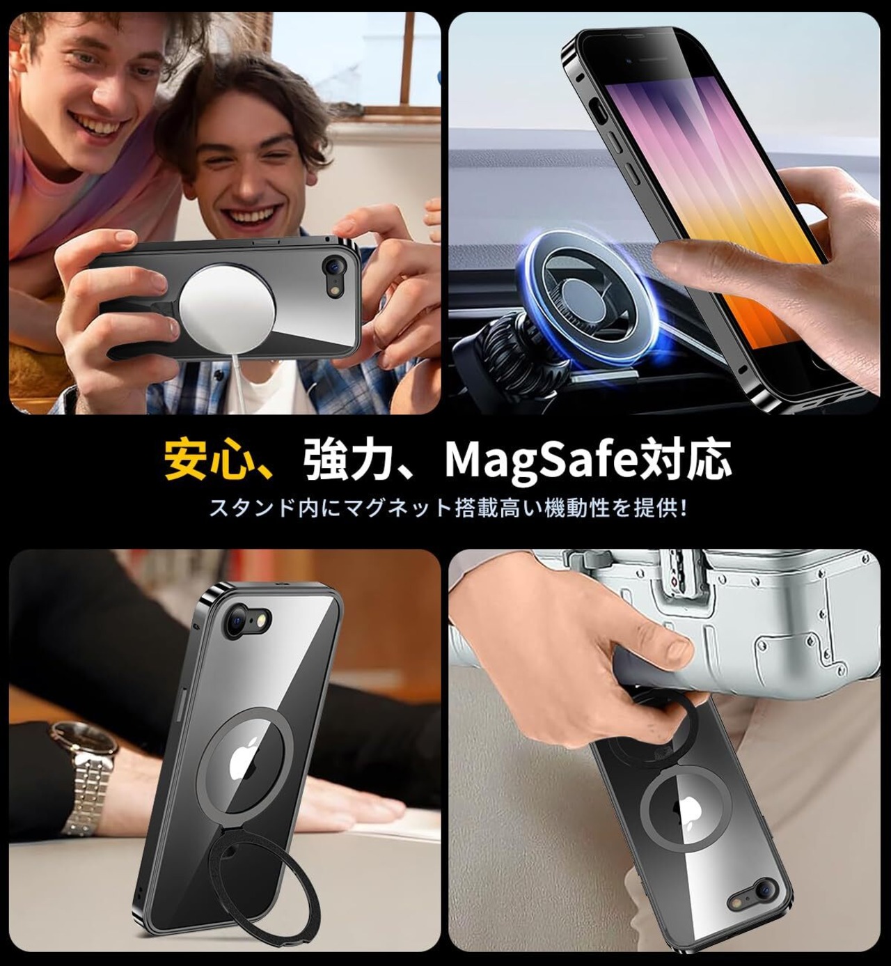 【全面革新!スタンド・CDリング・Magsafe対応】このiPhone SE3 ケース iPhone SE2 ケースは、動画鑑賞に便利なスタンド、CDパターンの質感の金属光沢のスマホリング、バッチリ付くMagsafe充電対応、多機能を一体化にしている、より便利で快適な暮らしを実現!このiPhone se 第3世代 ケースは、高品質のアルミニウム合金CD磁石リングを搭載し、おしゃれで高級感が溢れています。3Way置き対応、縦横とも自由自在、40ºー120º回転可能で、最適な視野角を調節できます。これからは、映画鑑賞、オンライン授業、リモート会議、ビデオ通話などで大活躍、いつでもどこでも便利になります。同時に、手に取る時、自撮りの時にも、指をリングに通してスマホの落下防止になります。スマホスタンドとスマホリングをわざと購入する必要がなく、コスパ最高とは言えます。また、このアイフォンSE3ケースはすべてのMagSafe対応アクセサリーに対応しているので、快適なスマホライフを共に過ごしましょう!