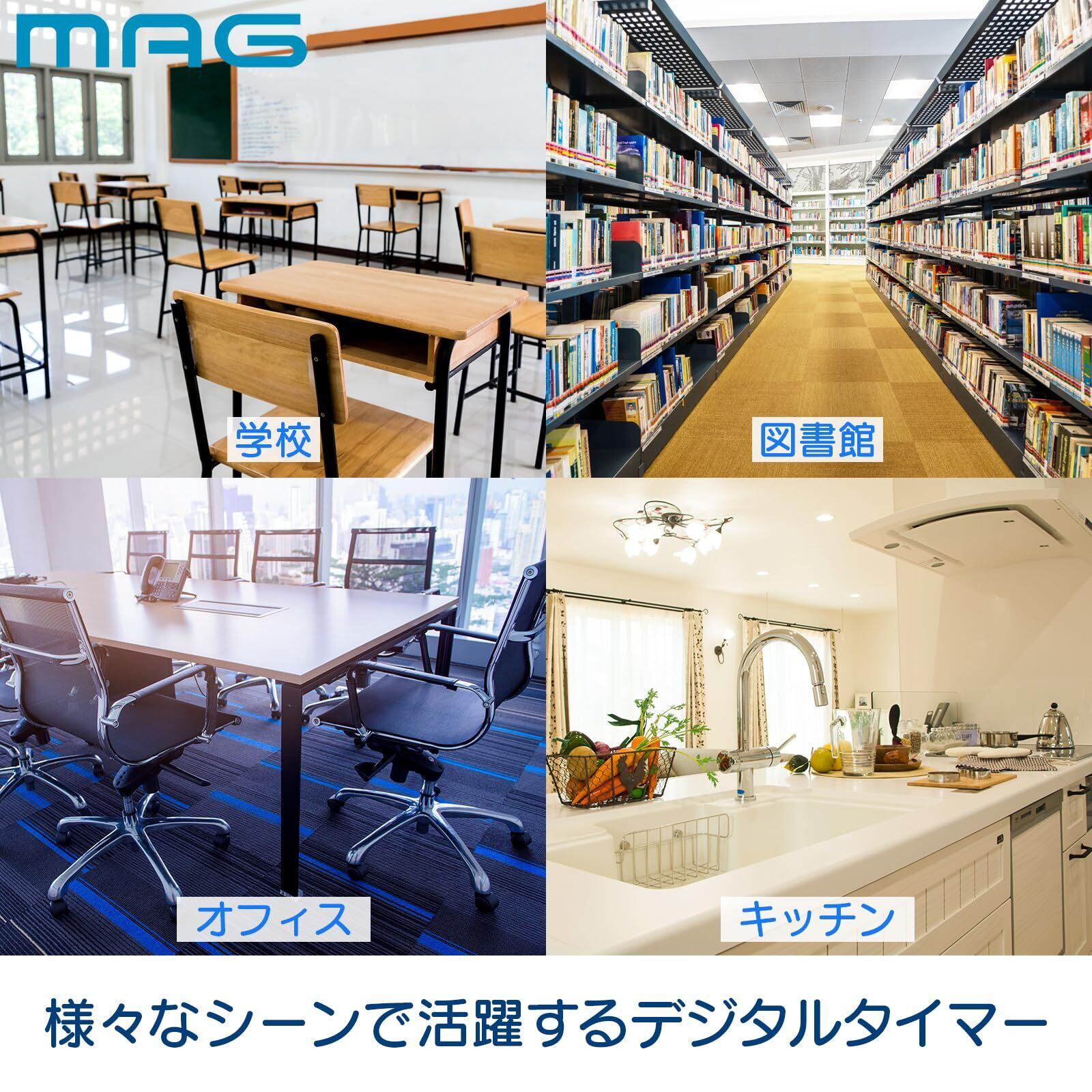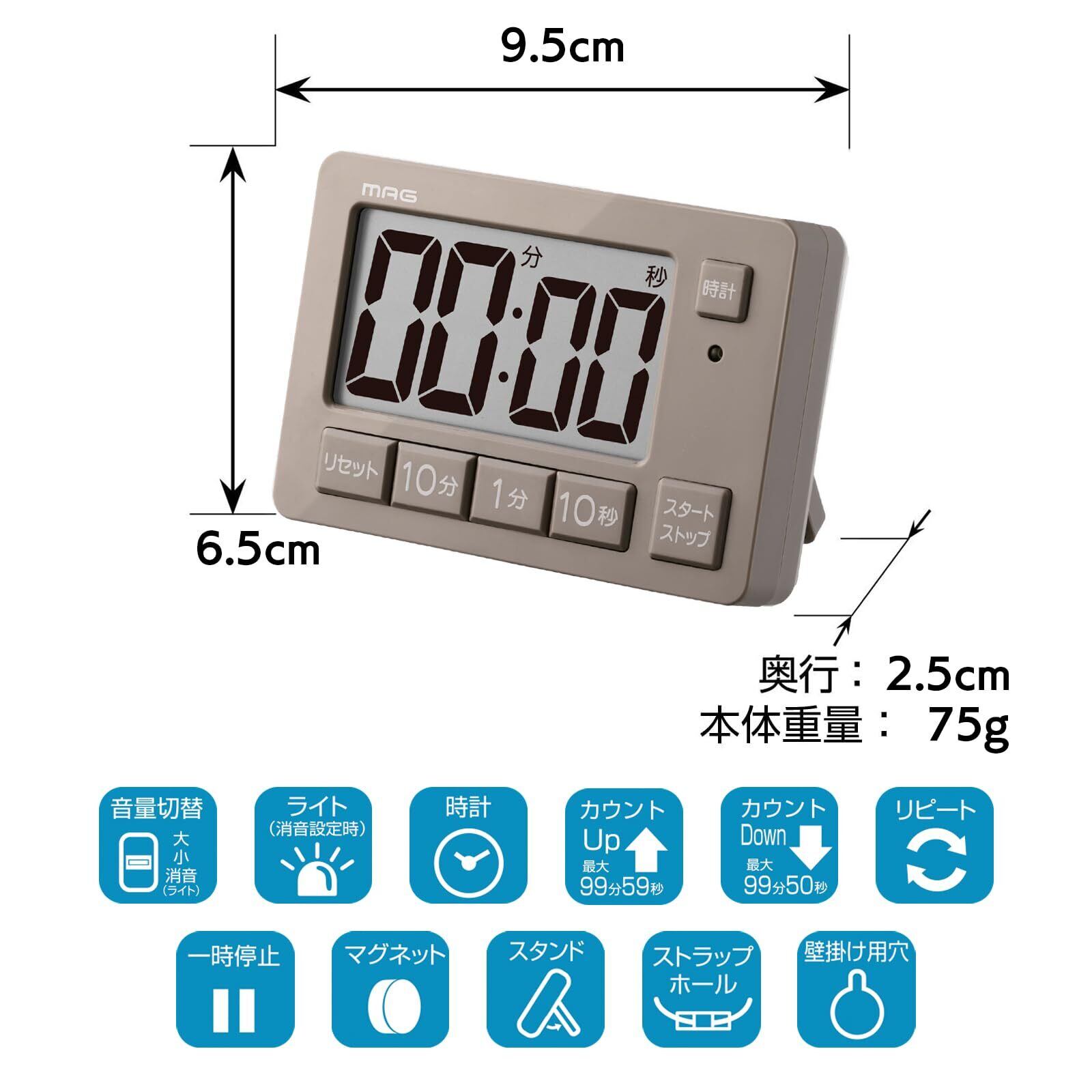 機能:カウントダウン(最大99分50秒)、カウントアップ(最大99分59秒)、リピート機能、一時停止機能、アラーム音量切替(大・小・消音(ライトが点滅))、時刻表示、12/24時間表示切替、本体裏マグネット付き、ストラップホール、置き掛け兼用(自立スタンド内蔵)