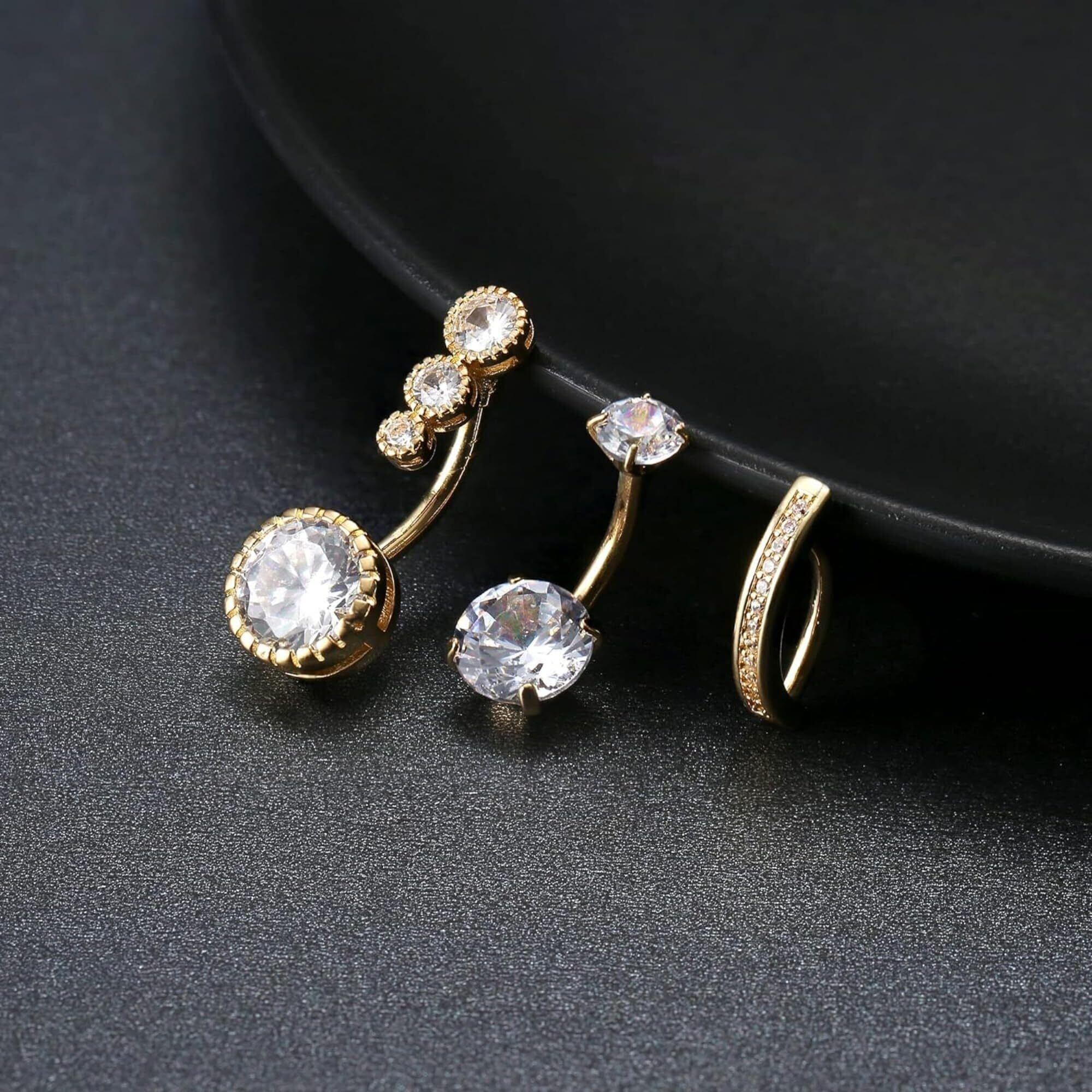 3個のピアスセット - パッケージには3個のへそピアスが含まれております。さまざまなシーンに応じて、さまざまなスタイルに合わせることができます。これらのへそピアスは、健康的な素材と実用的なヒンジ開閉デザインを組み合わせており、一体型のバックルを簡単に取り外しできます。