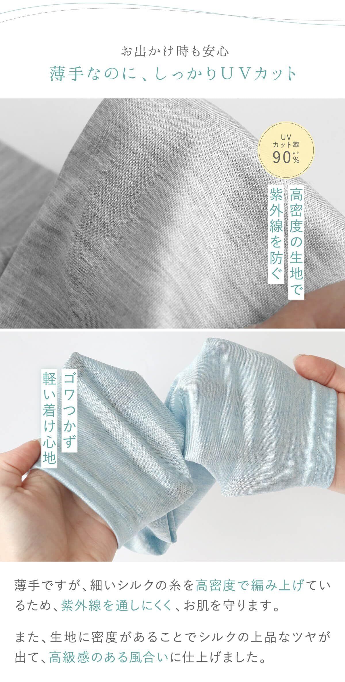 【薄手でも、しっかりUVカット】●薄手でゴワつかず軽い着け心地。 ●高密度の生地で紫外線を防ぐ。 薄手ですが、細いシルクの糸を高密度で編み上げているため、紫外線を通しにくく、お肌を守ります。