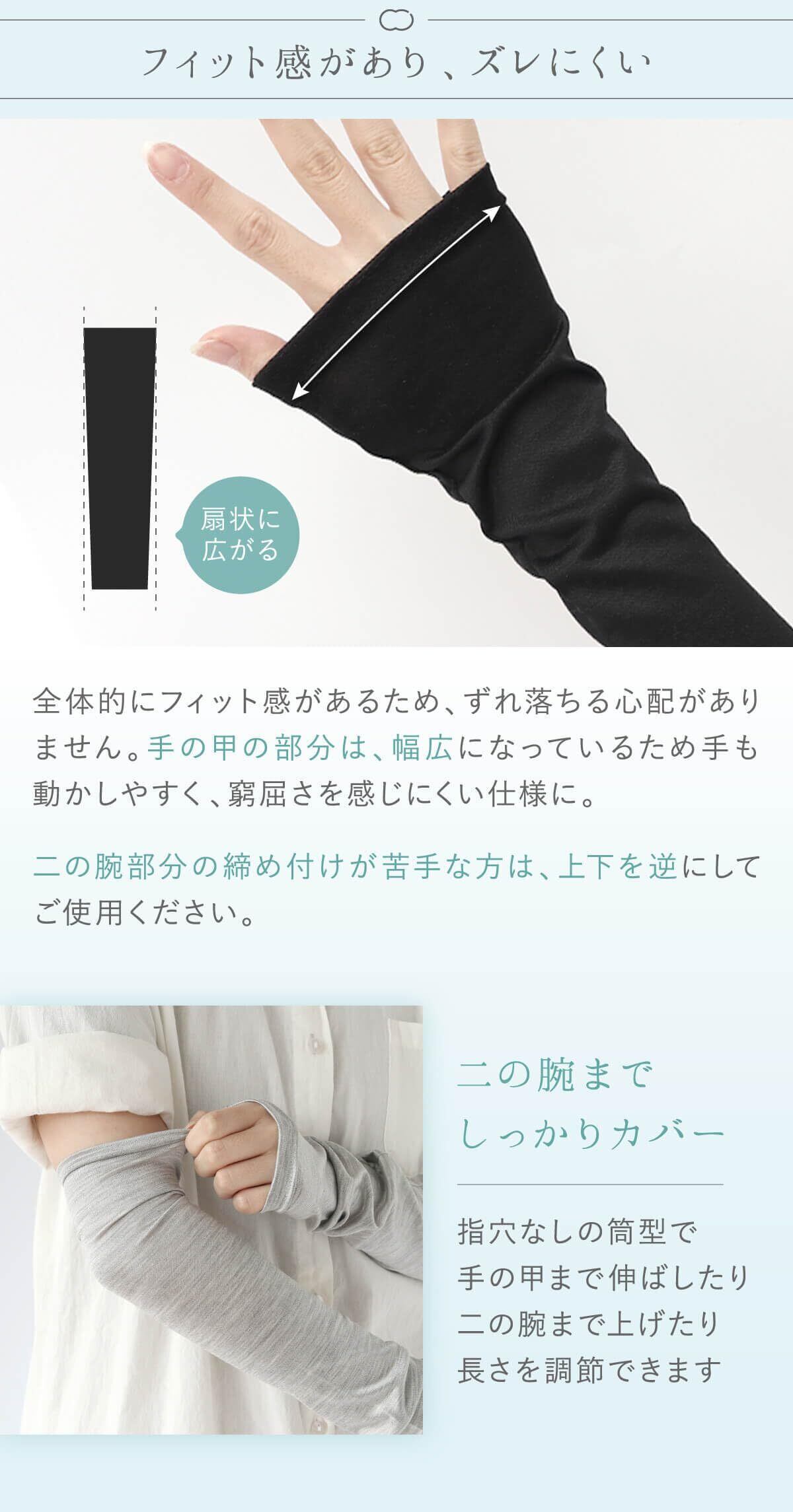 【伸縮して、着脱しやすい】高い伸縮性で、着脱しやすく、お出かけ前にサッと着けることができます。締め付け感も無く、ぴたっとフィットします。親指部分が縫われている指先開きタイプで、親指もしっかり日焼け対策していただけます。