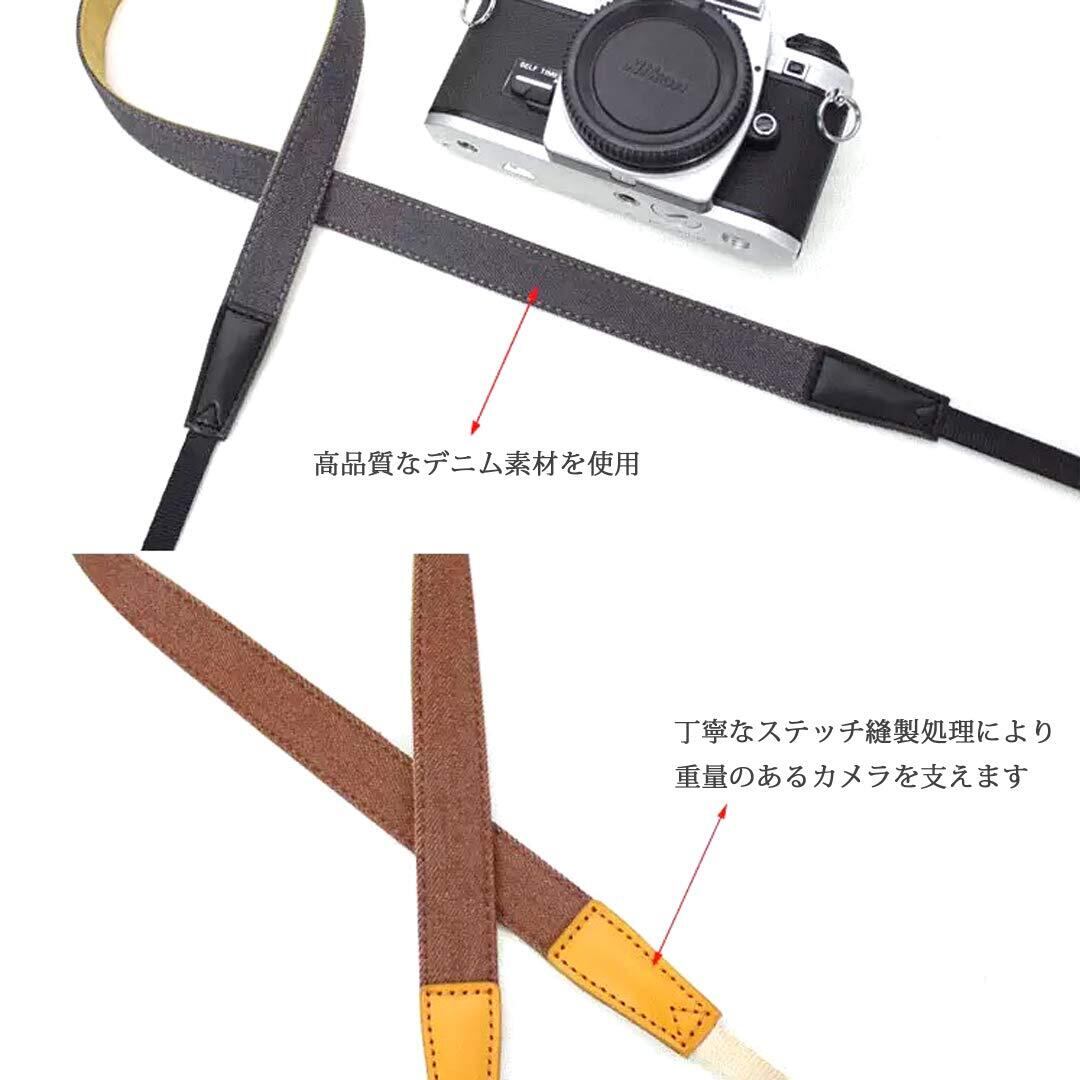 高品質な綿デニム素材を使用したレトロシンプルな細幅カメラストラップ。丁寧なステッチ処理とナイロンテープとの接続箇所にはPUレザーを使用。