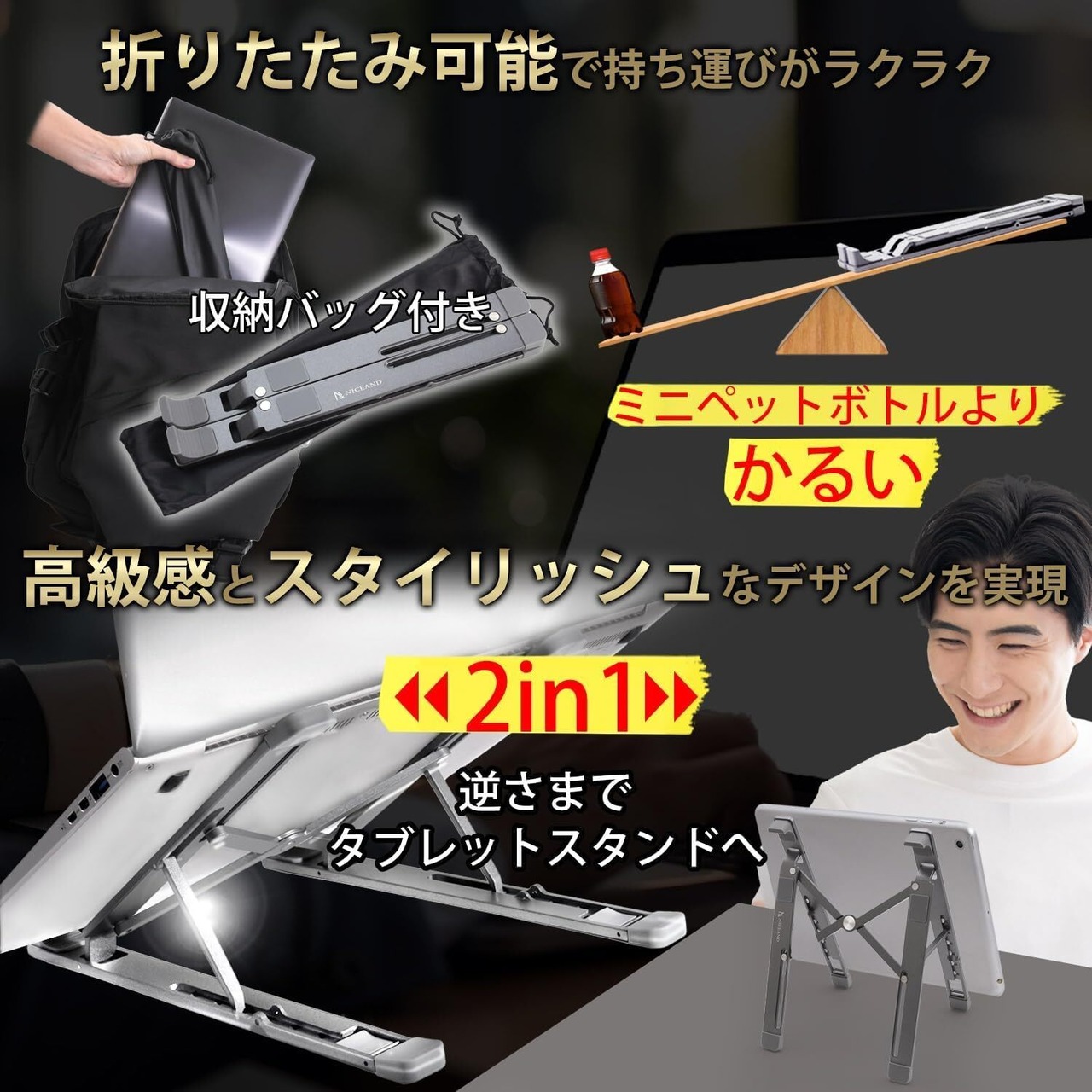 【持ち運び可能なPCスタンド】アルミ製で軽量、折畳み可能なノートパソコンスタンド。携帯性に優れ、外出時にも最適。PCスタンドで作業を効率化。