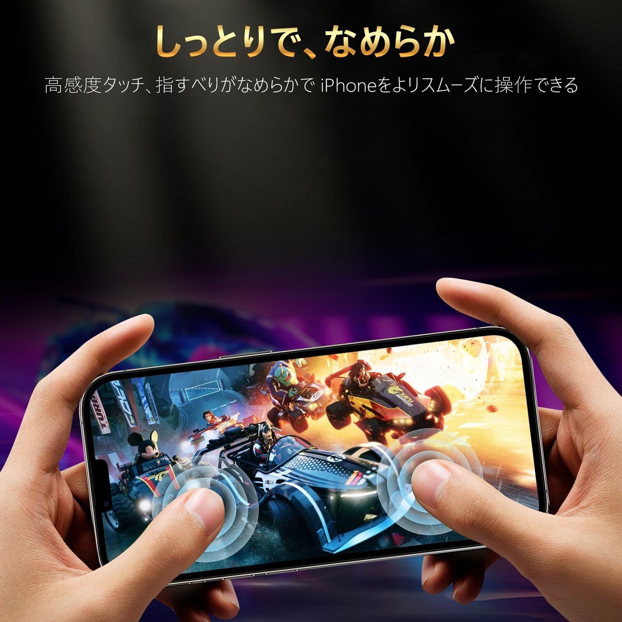 【指紋防止・高感度タッチ】このiphone 14 フィルムは、タッチ操作に遅延を感じることなく即反応します。高い撥油性・撥水性を持つ操作感が心地よいサラサラな指通り。画面に指紋を残さないので、スマホゲームとの相性もバッチリです。さらに、フィルムのFaceID部分は、顔認証の妨げにならないよう、底面に円形の切り込みを入れ、ホコリが溜まりにくい設計になっています。