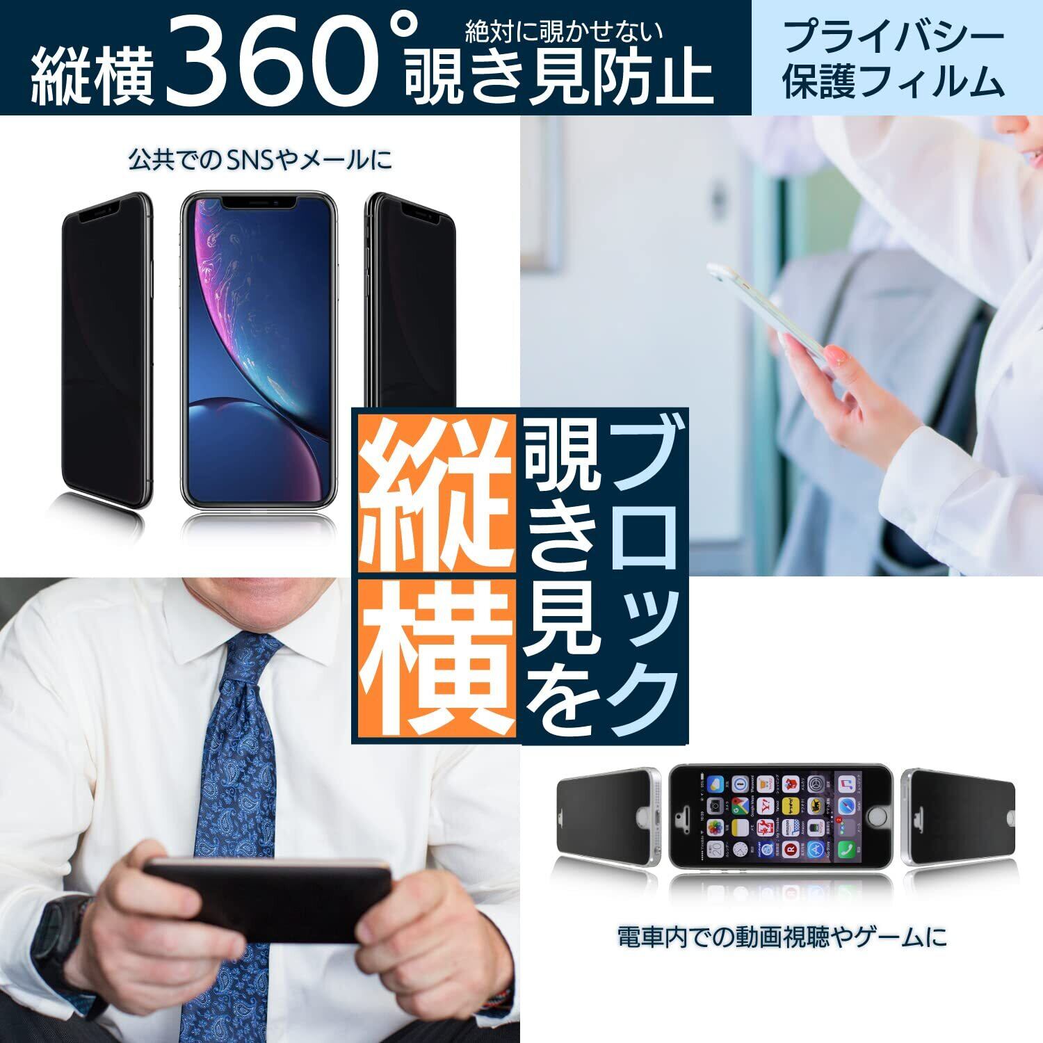 【 360度 のぞき見防止機能 】 縦持ち・横持ち両対応!どの角度からでも覗き見を防止します。電車などでも安心のプライバシー保護フィルムです。※画面を使用したバーコード決済などは、画面を明るくしてご使用ください。
