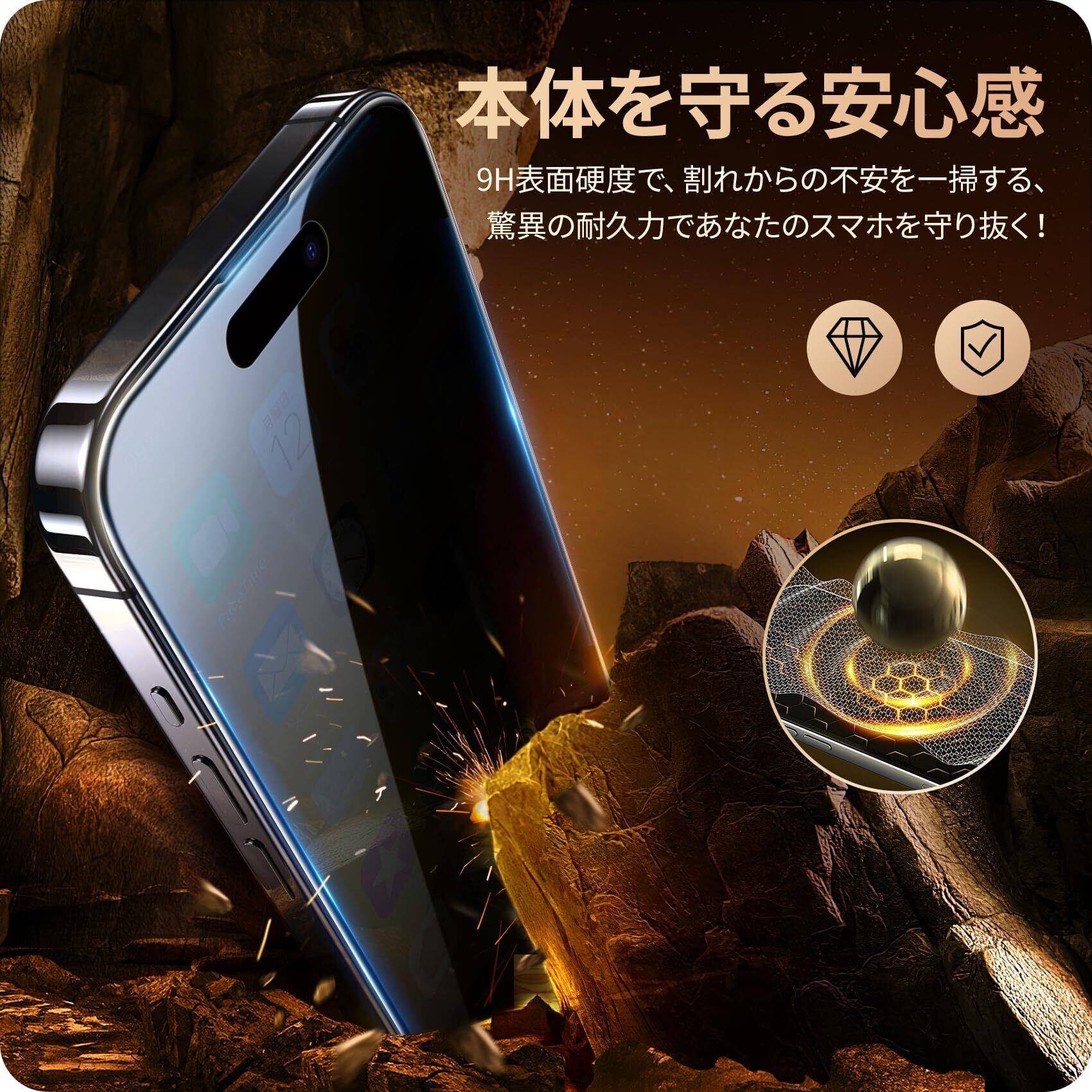 【スマホをしっかり守る】9H硬度ガラスを採用し、ハードコーティング技術により外部からの衝撃を吸収し、画面へのダメージを可能な限り抑えます。飛散防止加工により万一割れてもガラス破片が飛び散りにくいです。