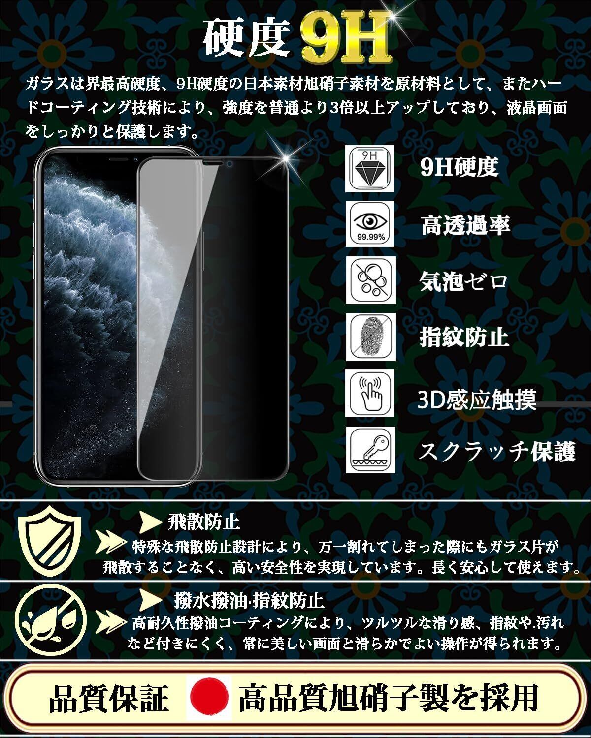 特徴 覗き見防止,9H表面硬度,飛散防止,防指紋,撥油コーティング,撥水剤,耐衝撃性,ラウンドエッジ,気泡なし,高透過率,簡単貼り付け