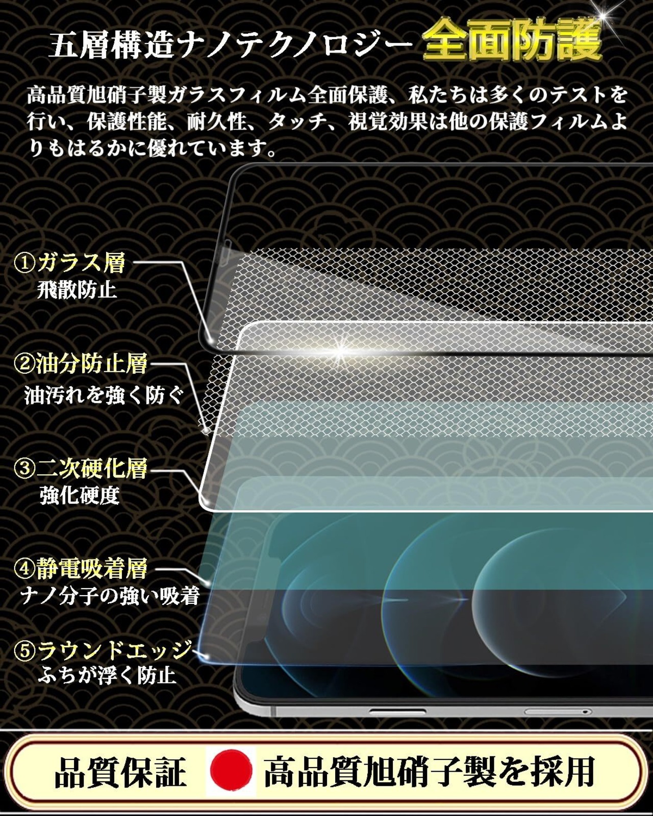 【気泡ゼロ・貼付け簡単】気泡防止加工が施されているので、気泡が入りにくい。万が一気泡が入ってしまっても時間が経てば徐々に抜けるので 美しい仕上がりに。自動吸着機能あり、ガラスを液晶画面スクリーンに軽く押すだけで自然に画面に吸着できます。初心者やフィルム貼りが苦手の方にも安心です。