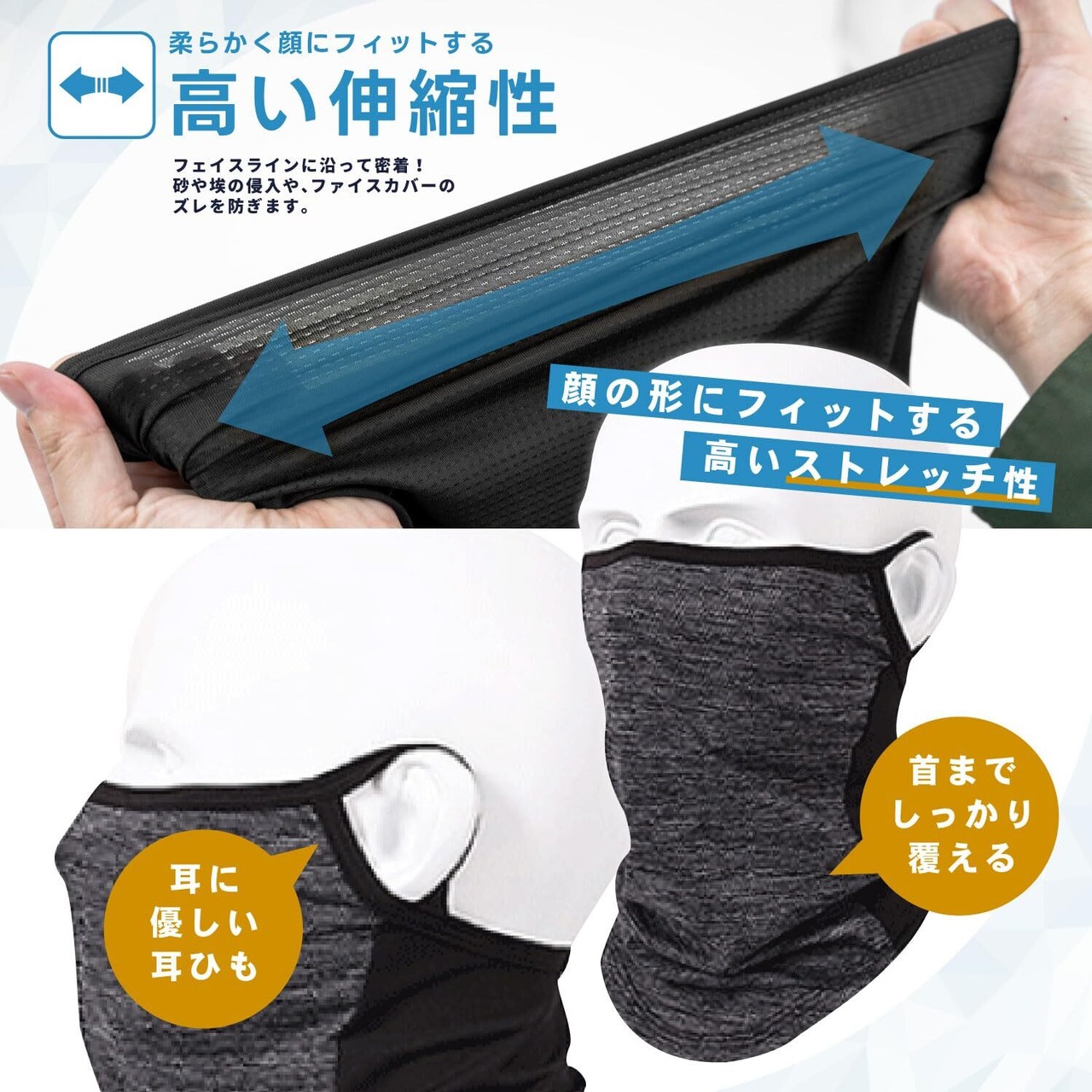<AIRフェイスカバー> 耳掛け部分は伸縮性素材で重量も30グラムと軽く、まるで付けていない様な感覚で、ランニング時の激しい運動でも落ちづらい!