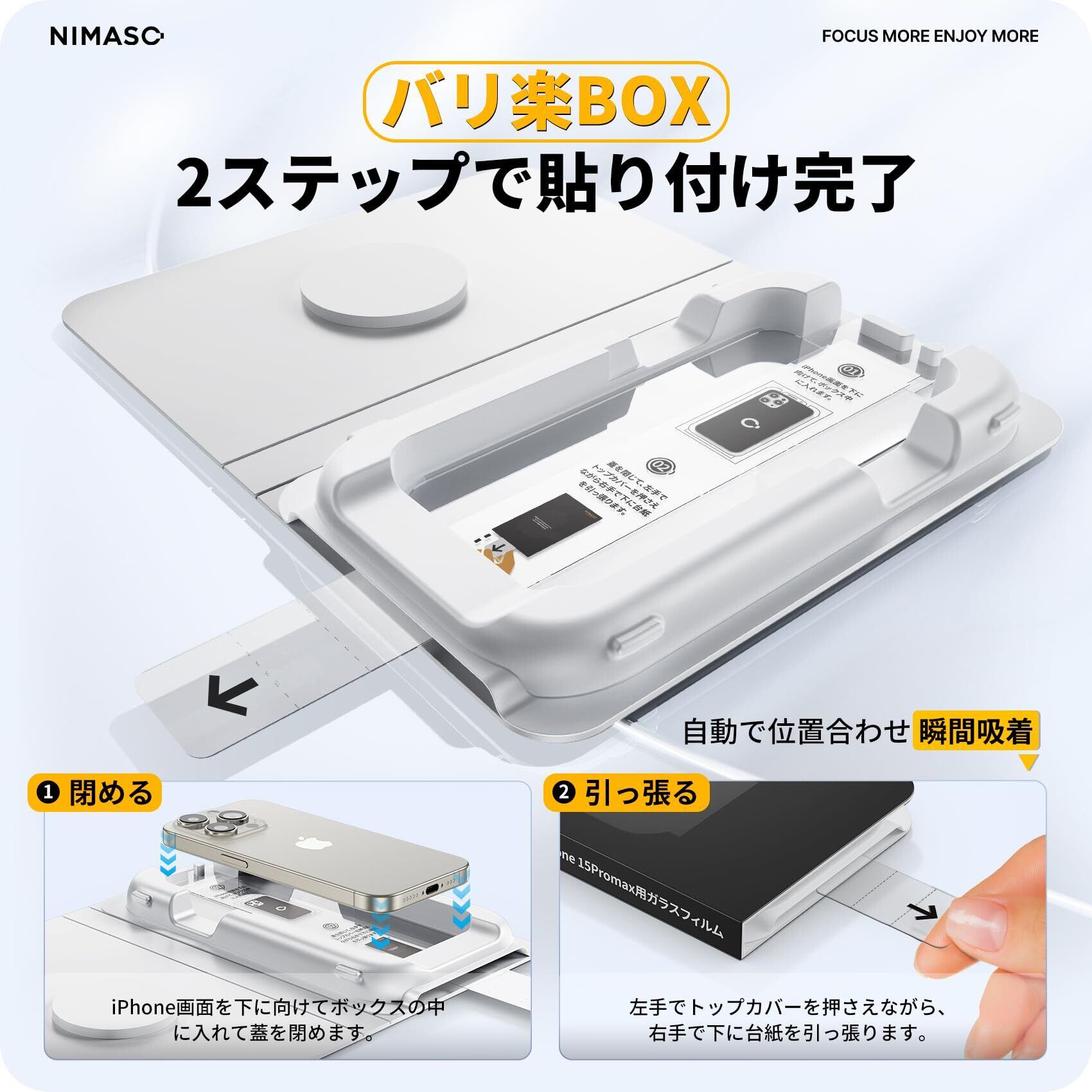 【たったの2ステップ・一瞬でズレがなく貼れる】NIMASO最新デザインのバリ楽Boxは、他の補助工具を必要とせず、簡単に貼り付けができます。バリ楽Boxには正確な位置決め装置が搭載されており、アイフォン15プロマックスの画面にぴったり合うようにフィルムが配置されています。これにより、iPhone 15 promax画面を下に向けて、ボックス中に入れて引っ張るだけで、誰でも位置ズレなく貼り付けが可能です。