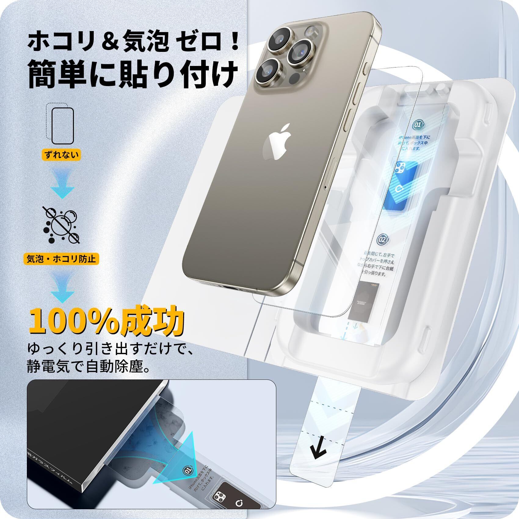 「バリ楽Box」NIMASO ガラスフィルム iPhone 15 Pro Max 用 強化ガラス 保護フィルム 失敗なし 超簡単貼り付け 気泡ゼロ 指紋防止 自動吸着 自動除塵セット付き 2枚セット アイフォン 15プロ マックス(6.7インチ)対応 NSP24D1264