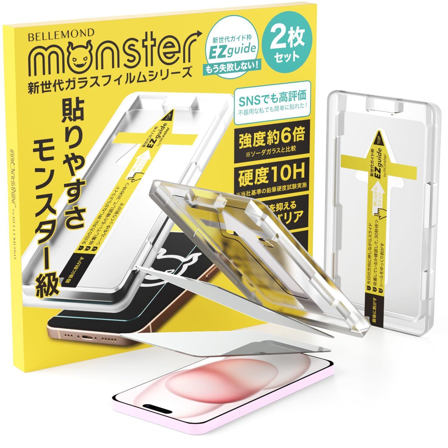 モンスターフィルム iPhone 15 用 クリア ガラスフィルム | 2枚セット ガイド枠付き | アイフォン 15 用 保護フィルム B0976