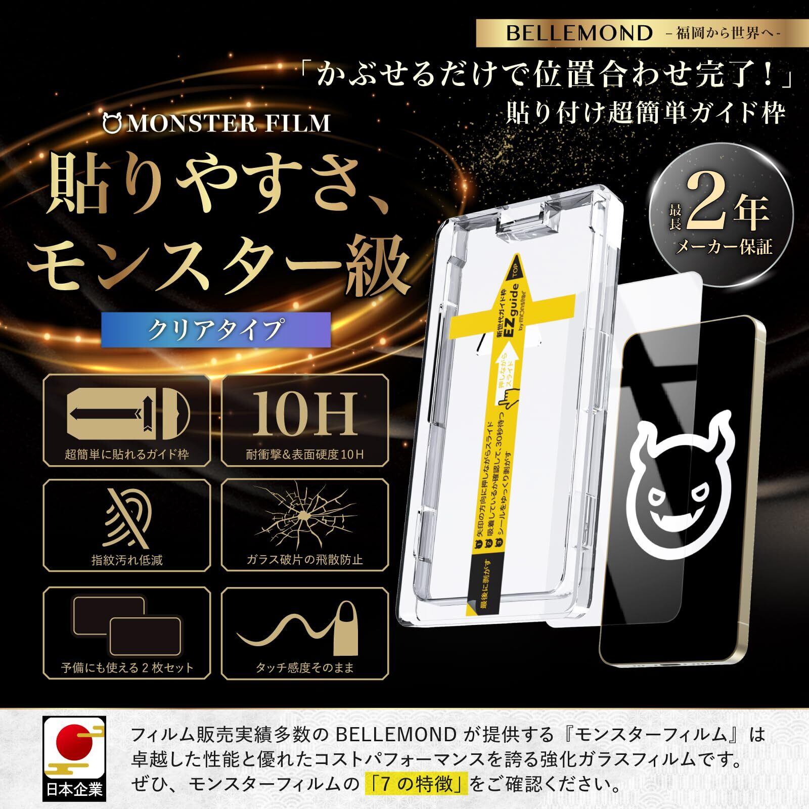 【カチャ、スー、パカッだけの簡単貼り付け】モンスターシリーズの「EZguide - イージーガイド - 」はガイド枠とガラスフィルムが一体型になった「ガイド枠一体型」貼り付けキットです。画面にガイド枠をかぶせるだけで、誰でも簡単に位置ズレのなく貼り付けが可能です。今までの貼り付け方に戻れないほど「簡単」で「貼りやすい」EZguideをぜひお試しください。