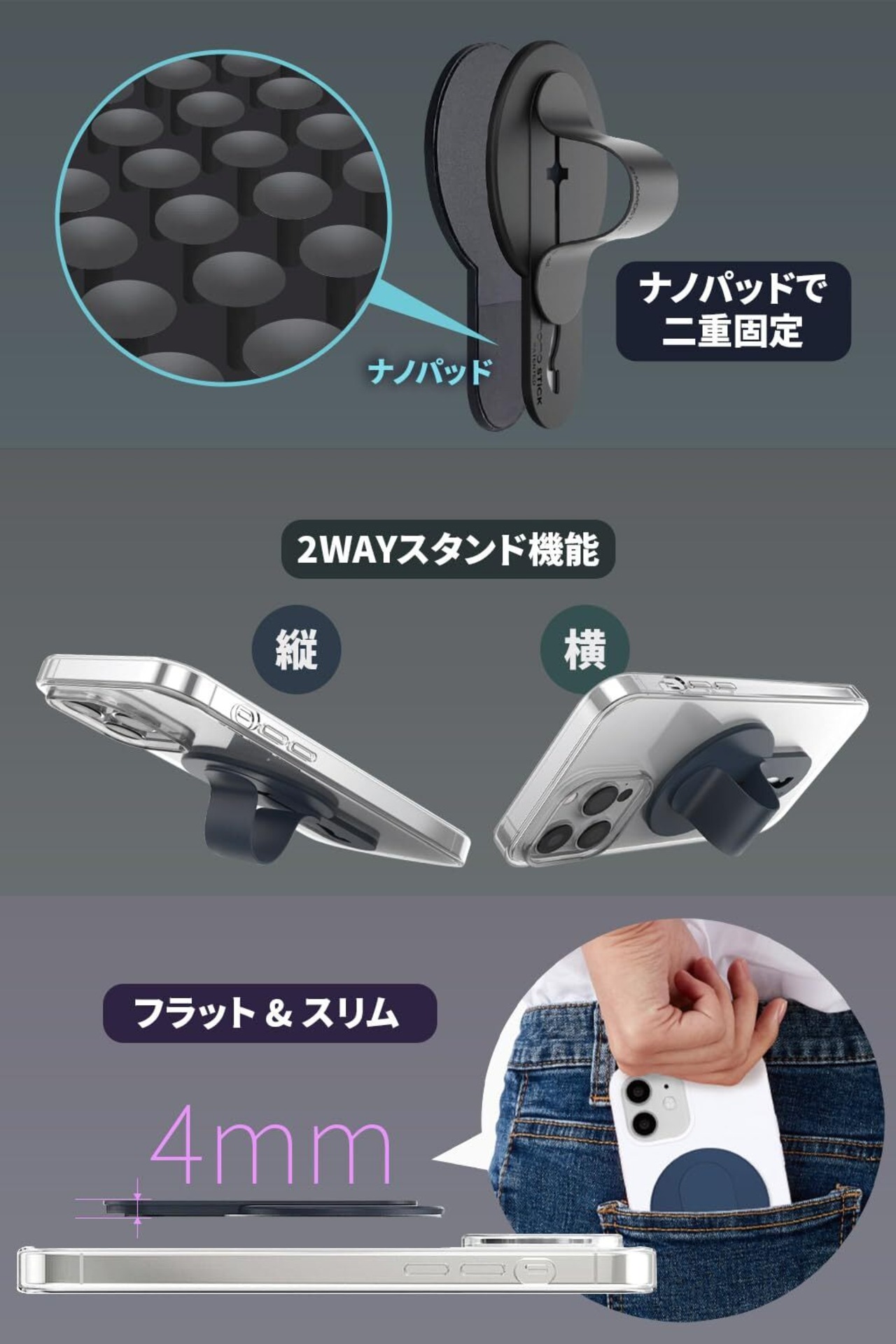 特許取得の独自グリップ付きMagSafe対応スマートスタンド【対応デバイス】MagSafe対応iPhone シリーズ、MagSafe対応スマホケース