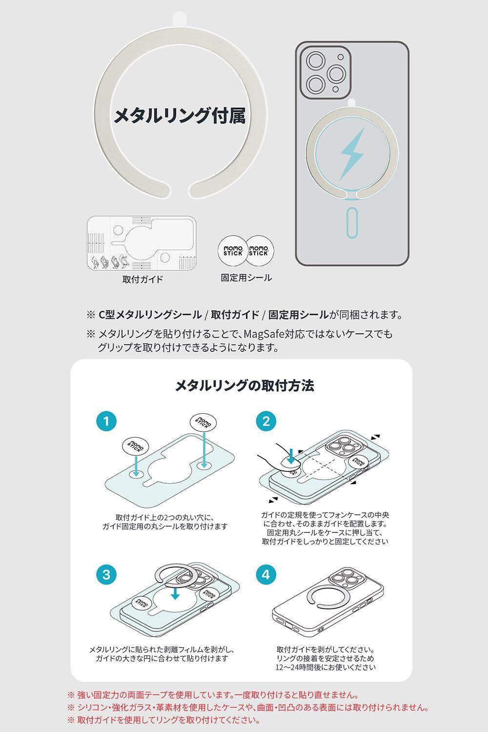 「Mag Flatstick MagSafe対応グリップスタンド」は、スマートフォンの使用中の落下防止やグリップ力向上、スタンド機能を兼ね備えた、「MOMO STICKグリップ」(特許取得)を搭載したMagSafeアクセサリです。 ●特許取得「MOMO STICKグリップ」 スライドベルトを引き上げて簡単に落下防止用のスマホグリップが作れます。 特許取得の独自形状で安定的に固定でき、使っていない時はスリムになります。 ●MagSafe対応 iPhoneのMagSafe機構を利用しマグネットで固定。 しっかりと吸着しながらも、取り外しは簡単です。 ※必ずMagSafe対応ケースの上からお使いください。 ※MagSafe充電器を使用する際は、グリップを外して充電してください。 ※ケースから外す際には上から引き離すように引っ張って外してください。 ●ベルトタイプで快適な使用感 肌触りの良いスライドベルトはフィット感がよく、長時間の使用でも快適に使用可能です。 ●フラットでスリムなデザイン グリップを使わないときは、スライドベルトをフラットな状態で収納可能。ポケットやカバンなどに入れても邪魔になりません。 ●グリップを好みの角度に調整可能 MagSafe吸着の範囲内で、グリップを左右に調整可能です。使い心地の良い角度に調整して使用できます。 ●ナノパッドで二重固定 何万もの細かな吸着構造のあるナノパッドで、デバイスをぴったりと固定。 マグネット吸着を更に強固にサポートします。 ●2WAYスタンド機能 グリップ部を使ってiPhone本体を立て掛ければ、スタンドとしても使用可能です。 スタンドは用途によって縦・横の2通りの使い分けができ、動画視聴などの際に便利です。 ●メタルリング付属 C型メタルリングシールが同梱されます。 メタルリングを貼り付けることで、MagSafe対応ではないケースでもグリップを取り付けできるようになります。 <メタルリングの取付方法> 1. 取付ガイド上の2つの丸い穴に、ガイド固定用の丸シールを取り付けます。 2. ガイドの定規を使ってスマートフォンケースの中央に合わせ、そのままガイドを配置します。 この際、固定用丸シールをケースに押し当て、取付ガイドをしっかりと固定してください。 3. メタルリングに貼られた剥離フィルムを剥がし、ガイドの大きな円に合わせて貼り付けます。 4. 取付ガイドを剥がしてください。リングの接着が安定するまでには12〜24時間程度かかります。グリップはそれ以降にお使いください。 ※メタルリング取付の際の注意事項 1. 強い固定力の両面テープを使用しています。一度取り付けると貼り直せません。 2. シリコン・強化ガラス・革素材を使用したケースや、曲面・凹凸のある表面には取り付けられません。 3. 取付ガイドを使用してリングを取り付けてください。 【対応デバイス】 MagSafe対応iPhone シリーズ、MagSafe対応スマホケース