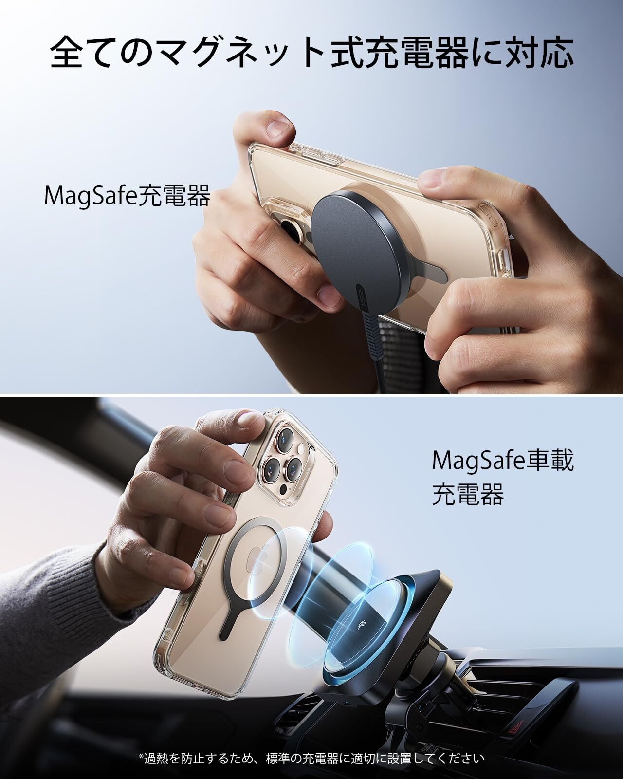 【あらゆる充電器に対応】MagSafe充電にも対応しているし、標準的なワイヤレス充電器を使うこともできます。過熱を防止するために、スマホを標準的なワイヤレス充電器の正しい位置に置くようにしてください。