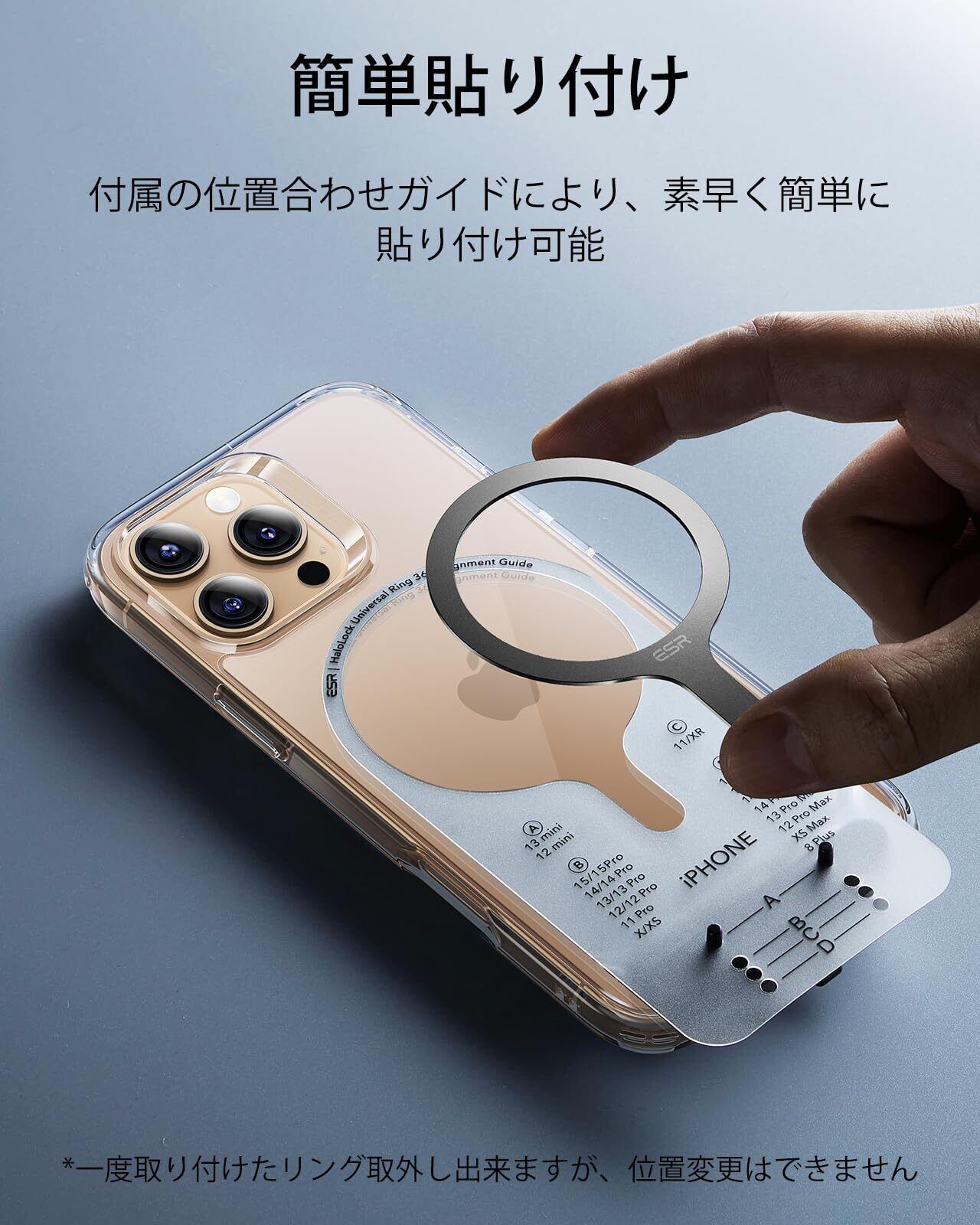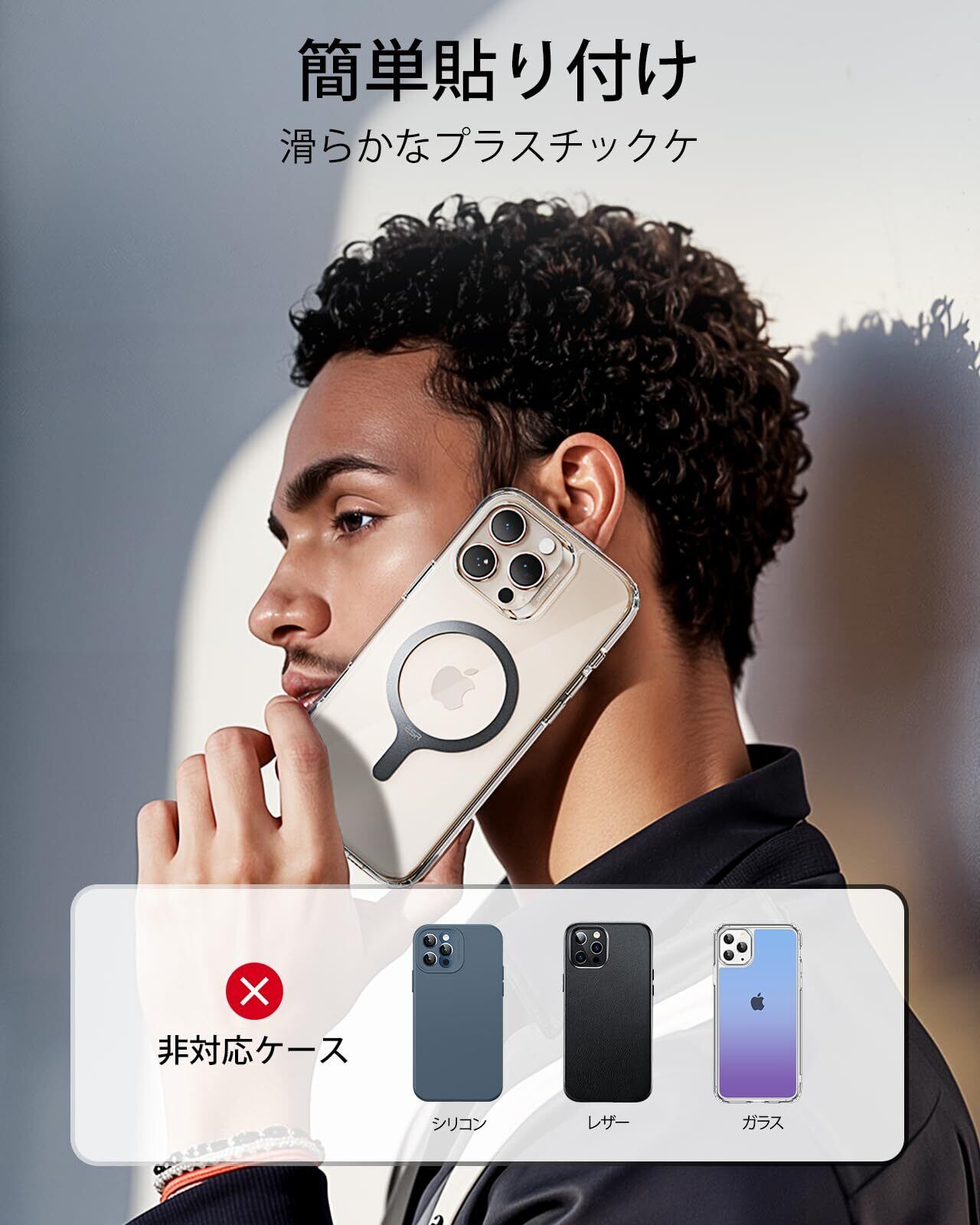 ️【重要】必ず金属リングはスマホケースの外側に貼り付けてください。ケースの表面が平らで滑らかな場所に貼ることが必要です。本製品は、革製ケースや液体シリコンケース、またはケースなしのスマホには対応しておりませんのでご注意ください。また、磁力に影響が出るため、スマホケースの内側にリングを貼ることはお控えください。
