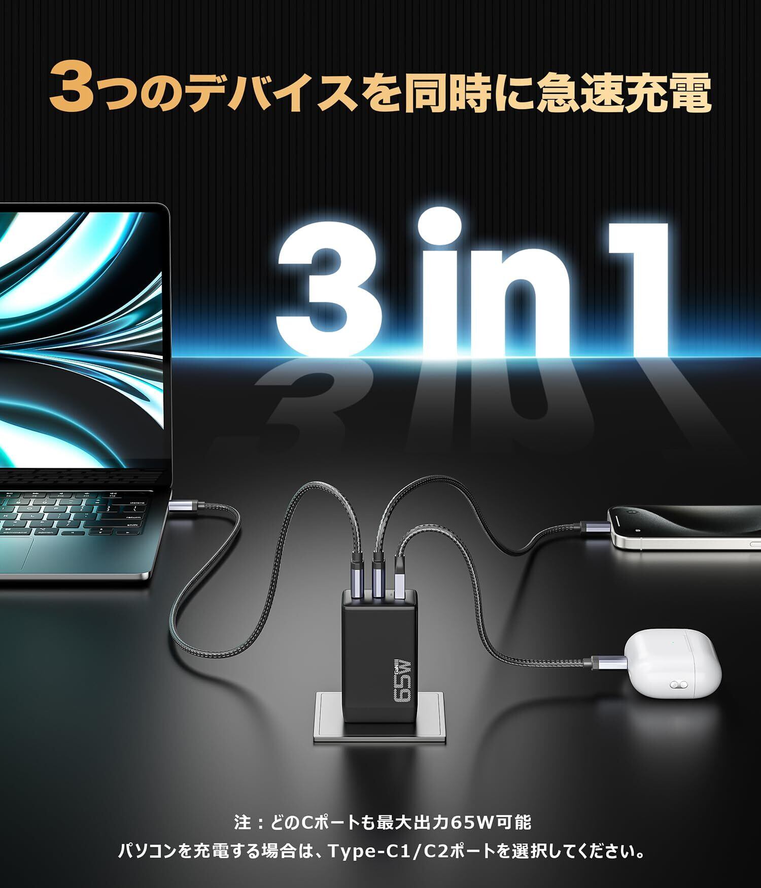 PD 65W 充電器 type-c 3ポート 三台同時充電 タイプc 折り畳み式 GaNIII技術 1M USB-C to C ケーブル付き ナイロン編み iPhone16e/iPhone16/15/14 MacBook iPad Galaxy Android各種 その他USB-C機器対応 PSE技術基準適合 黒