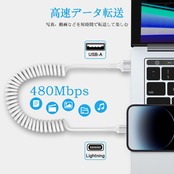 【Lightningケーブル コイル状】USB-A to Lightningコイル状デザインのLightning充電ケーブルは、縮んだ45cmで、最大180cmまで伸ばすことができて、寝室、オフィス、車の後部座席でも簡単に充電できます。(100cm〜150cmがおすすめの長さです。)なお、この充電コードは高品質PU素材と耐久性のある銅線を採用し、素早く反発し、裂けるや結びることがありません。(ご注意:弾性と耐久性の設計により、気をつけてご使用ください。 安全のために、最大まで伸ばさないでください。)