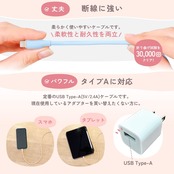 ▶▶▶【断線に強い】硬くて丈夫でも不便なら意味がない。「もちっと」は柔軟性と耐久性を両立した便利なケーブルです。取り回し自由な柔らかさと折り曲げ試験を30,000回クリアした"強さ"お試しください。【Type-A】定番のType-A(タイプA)なので、今使っている充電器をそのまま活用できます。