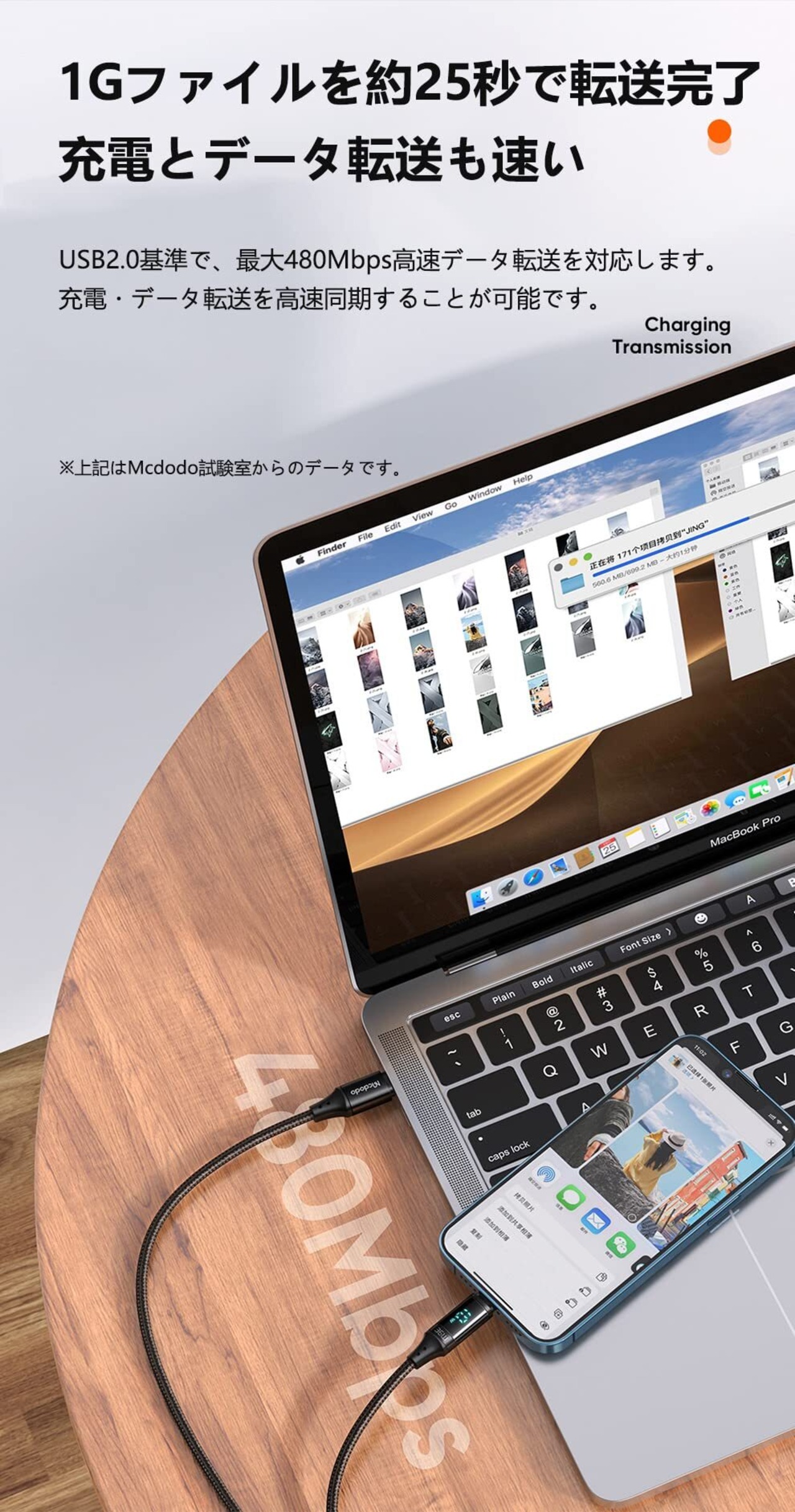 【36W急速充電】:スマートデュアルチップでMcdodo独自研発のMSC技術(Mcdodo Smart Charging)を搭載し、接続デバイスの電量状態によって、スマートに電圧電流を一致でき、充電の安全をすることが可能です。USB PD (Power Delivery)による最大36Wの高出力で接続機器への高速充電を対応します。且つPD20W/18Wを下位互換します。【高速データ転送】:USB2.0基準で、最大480Mbpsの高速データ転送が可能です。大容量のファイル・写真を数秒で転送完了します。(※上記はMcdodo試験室からのデータです。ご使用になるデバイスの性能などにより、供給される電流値が異なる場合があります)。