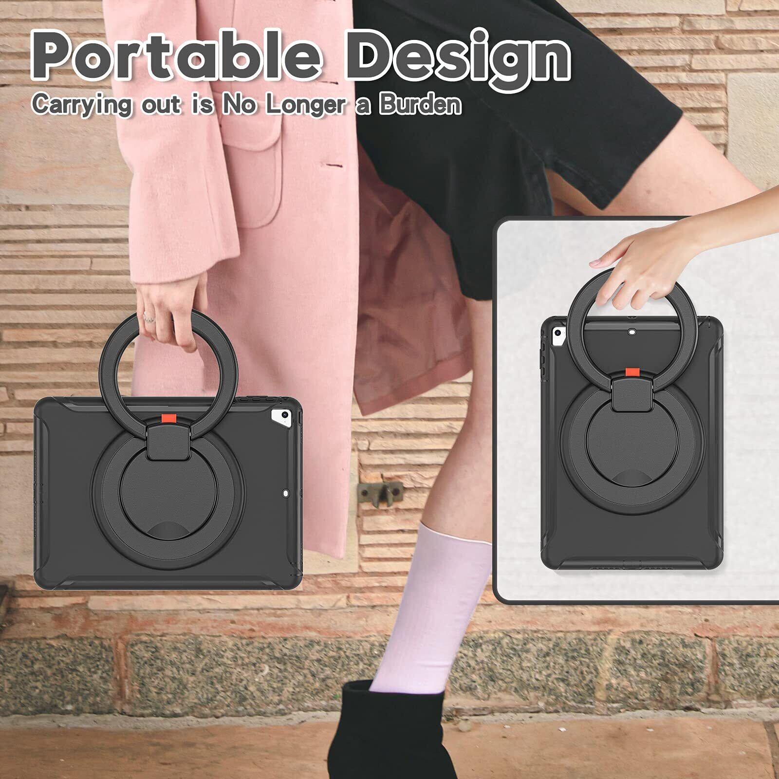 新型 iPad 2018 第6世代 2017 第5世代 ケース リング付き 衝撃吸収 軽い 頑丈 360°回転スタンド 多方向 ハンドル付 iPad Air2 Pro9.7 カバー 落下防止 キズ防止 キッズ アイパッド9.7 ケース (iPad5/iPad6/Air2/Pro9.7, 黒)