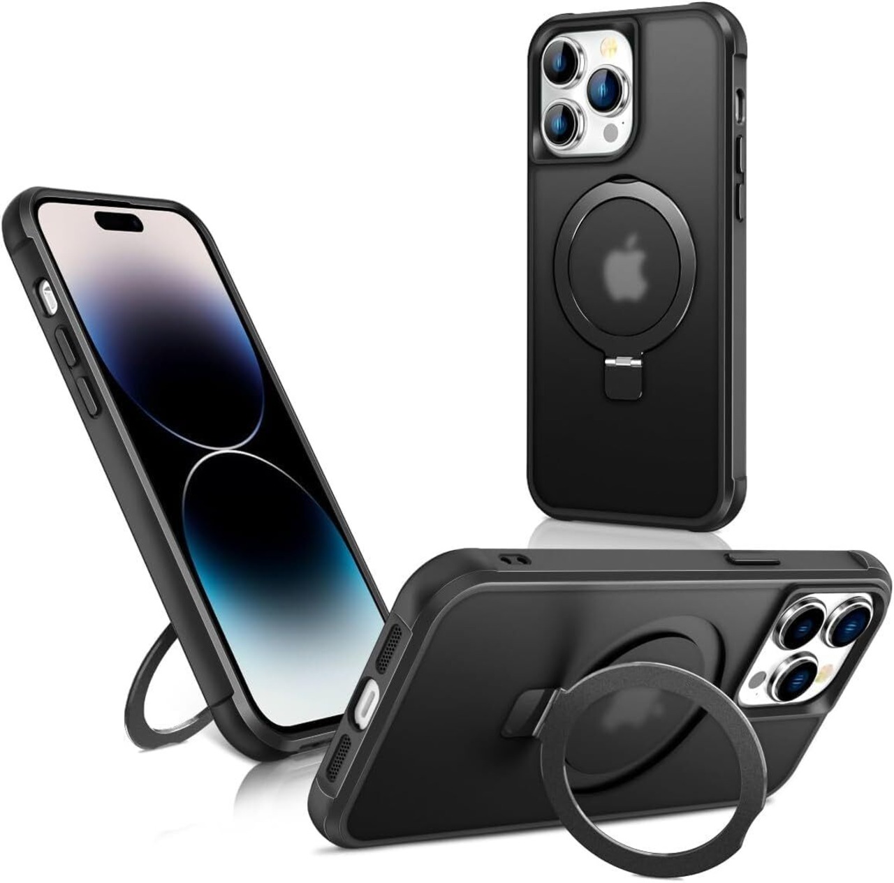 【在庫セール】360スタンド iPhone 15 ケース MagSafe対応 マグネット搭載 半透明 アイフォン15 スマホカバー 隠しリンク付き 360°回転スタンド ストラップホール付き カメラ保護 カバー 耐衝撃 軽量 薄型 おしゃれ, ブラック | ニコニコSHOP
