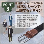 【用 途】ビジネスからカジュアルまでスタイルを問わず幅広いシーンで活躍、プライベートのファッションでコーディネートしやすいアイテムです。伸縮性があり、ウエストのサイズに変動があってもどこからでも通せるので調整がスムーズ。穴の数や位置が決まっているベルトと違い、自分のサイズに合わせてこまめな調整ができます。