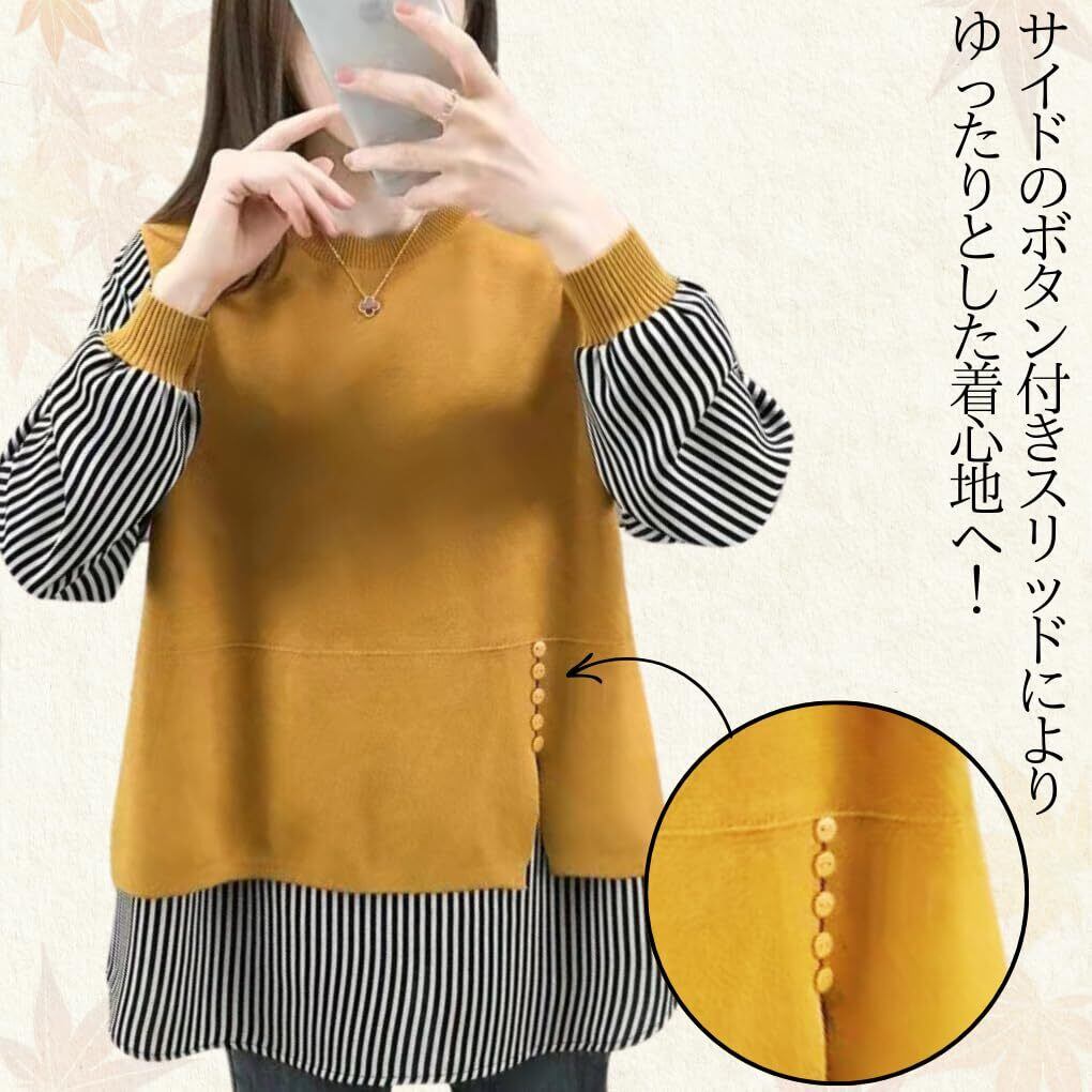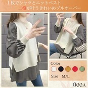 ニットベストとシャツがドッキングしたような重ね着風のデザインが、トレンドライクと防寒効果を合わせもつ優秀アイテムです。 清潔感漂うストライプのシャツ生地と、しっかりとしたニット素材を使用しています。身頃のニット部分は伸縮性があり着心地も抜群で、袖と裾のシャツ生地はスタイリッシュ感を演出してくれます。 サイドにボタン付きのスリットが入っているので、ノンストレスでゆったりとした着用感のデザインです。 お手入れがしやすいポリエステル混の素材なので、丸めてもシワにもなりにくいのが嬉しいポイント◎ ヒップにかかる丈感は、自然と体型カバーも叶います。