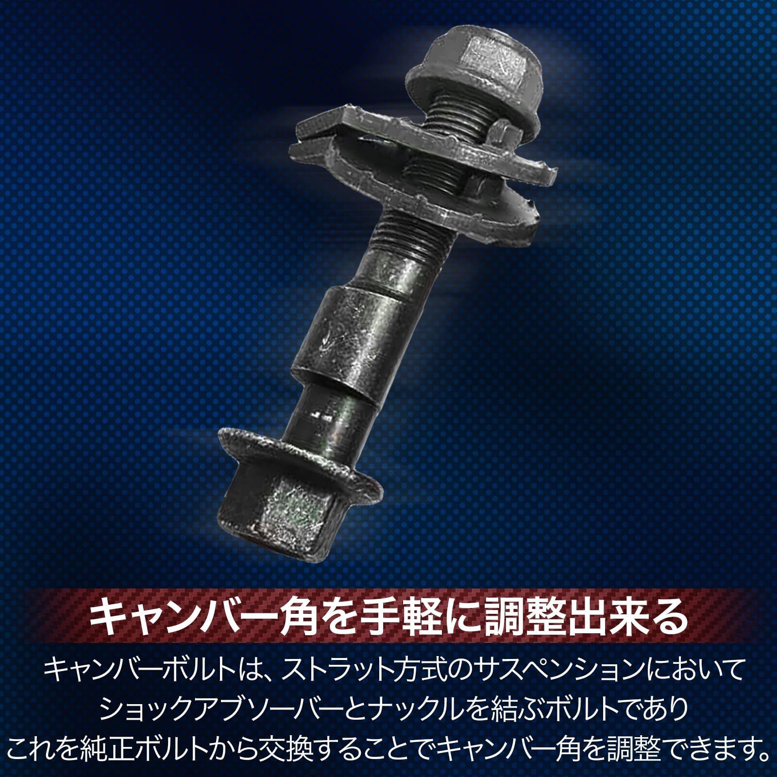 【参考車種一例】ノート、フィット、シビック、フリード、カローラフィールダー、エクストレイル、リーフ、レヴォーグ、ステップワゴン、セレナ、エルグランド、アウトランダー、ティアナ、CR-Z、インサイト、フォレスター、マーチ、ストリーム、プレサージュ、キューブ、デリカD:5、ウイングロード、インプレッサ、ジューク、ティーダ、エアトレック、アクセラ、シルビア、ローレル、ステージア、プレーリーリバティ、ブルーバードシルフィ、ラティオ、ティーノ、プロボックス、セフィーロ、エスクード、ムラーノ、bB、ライトエース、タウンエース、モビリオ、NV200バネット、S60、86、インテグラ、エクシーガ、サクシード、ファンカーゴ、プラッツ、TOYOTA、SUZUKI、HONDA、NISSAN、MITSUBISHI、DAIHATSU、MAZDA、など汎用タイプなのでその他14mmのキャンバーボルト装備車にも対応します。(※車種によってフロントのみ、リアのみの適合となる場合がありますので、ご購入前にご自身でご確認ください)