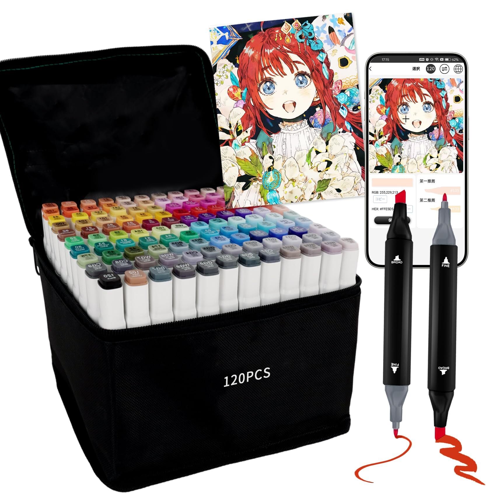Vokiuler アートマーカー アルコールマーカー セット 120色 イラストマーカー ブレンダーペン カラーペンセット 太細両端 画材 コミック用 プレゼント