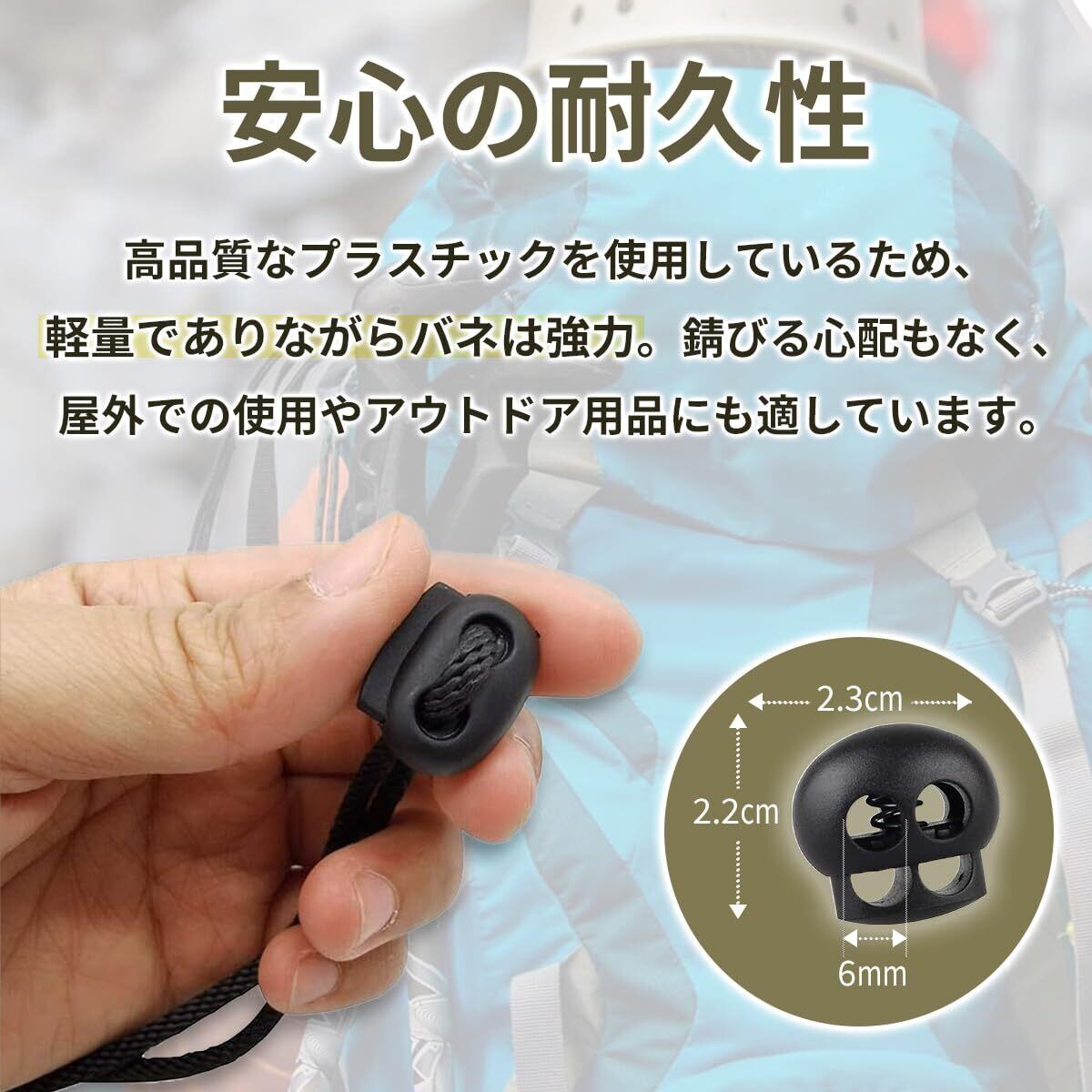 【安心の耐久性】 高品質のプラスチック製で軽量でありながらバネも強力。頻繁な使用にも劣化しづらく、長期間にわたりご使用頂けます。 プラスチック製のため錆びる心配がなく、屋外での使用やアウトドア用品にも適しています。 【1個当たりの製品サイズ】高さ2.2cm×幅2.3cm(穴径6mm) 本商品は「6mmジャストサイズの紐」ではかなり通しづらくなります。6mmより少し細めの紐を想定したサイズ設計です。購入前にあらかじめご確認ください。