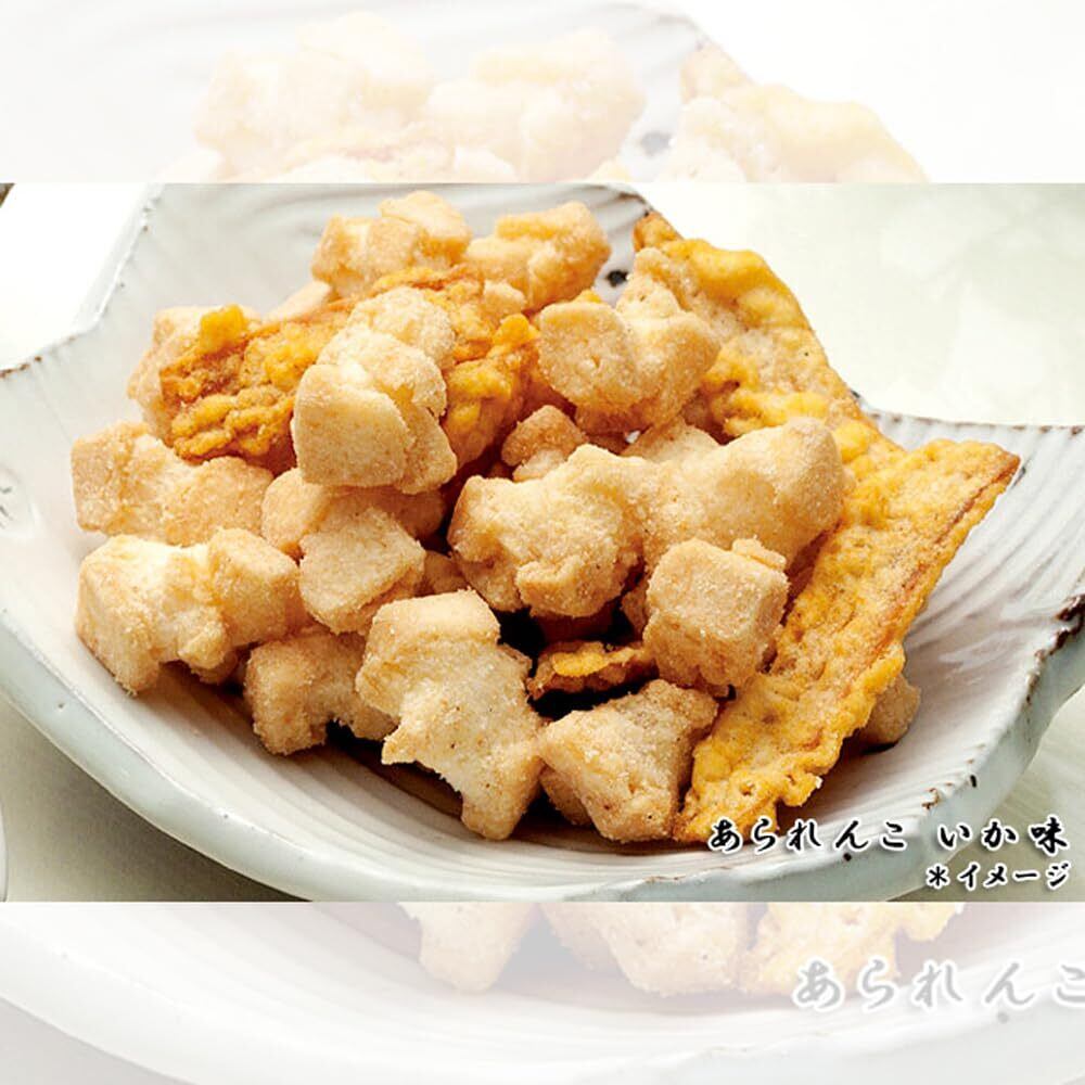 しょっつる味:もち米、植物油、醤油(小麦・大豆を含む)、砂糖、魚醤(しょっつる)、デキストリン、発酵調味料、たん白加水分解物(大豆含む)、加工澱粉、調味料(アミノ酸等)、酸化防止剤(ビタミンE) いか味:もち米、植物油、いかシーズニング(小麦、えび、大豆を含む)、いか粉、えびパウダー、(小麦・大豆を含む)、食塩、調味料(アミノ酸等)、香料(いか・大豆由来)、ソルビット、甘味料(カンゾウ・ステビア)、酸化防止剤(ビタミンE)、カラメル色素 えび味:もち米、植物油、食塩、えびパウダー(小麦・大豆を含む)、えび、たん白加水分解物(大豆を含む)、調味料(アミノ酸等)、紅麹色素、酸化防止剤(ビタミンE)