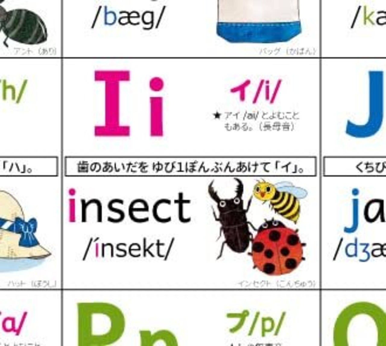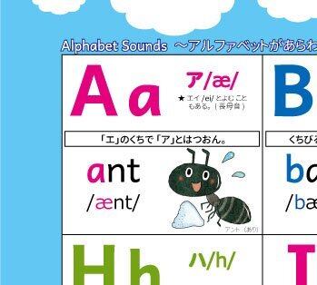 アルファベット26文字と二重音字のフォニックスが学べる。発音記号付き。