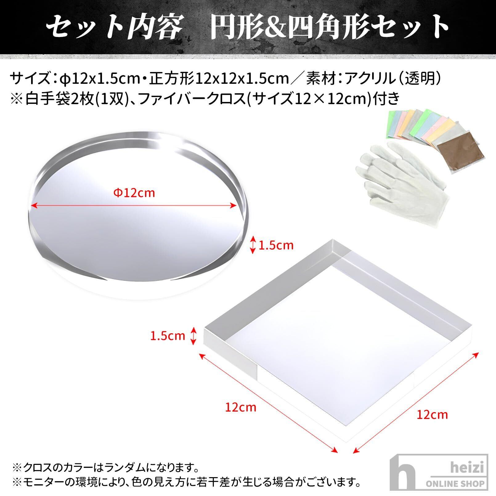 【商品内容】 [円形&四角形セット]サイズ:円形φ12x1.5cm・正方形12x12x1.5cm 素材:アクリル(透明) ※各白手袋2枚(1双)・ファイバークロス(サイズ12×12cm)カラーランダム付き ※モニターの環境により、色の見え方に若干差が生じる場合がございます。