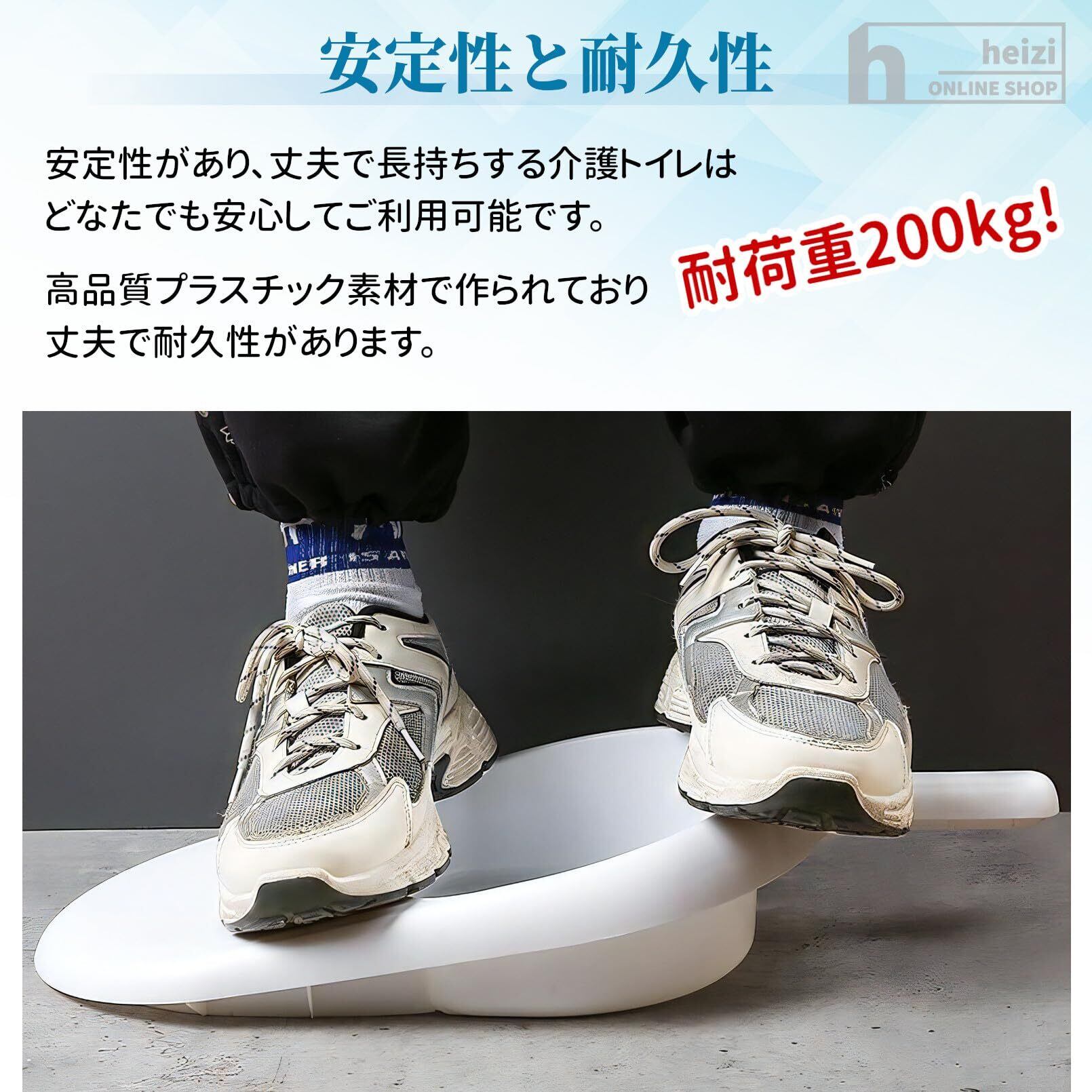 【安定性と耐久性】耐荷重200kg!安定性があり、丈夫で長持ちする構造の介護トイレです。高品質プラスチック素材で作られており、丈夫で耐久性があります。毎日、何回使用しても、頑丈さと安定性を維持できます。