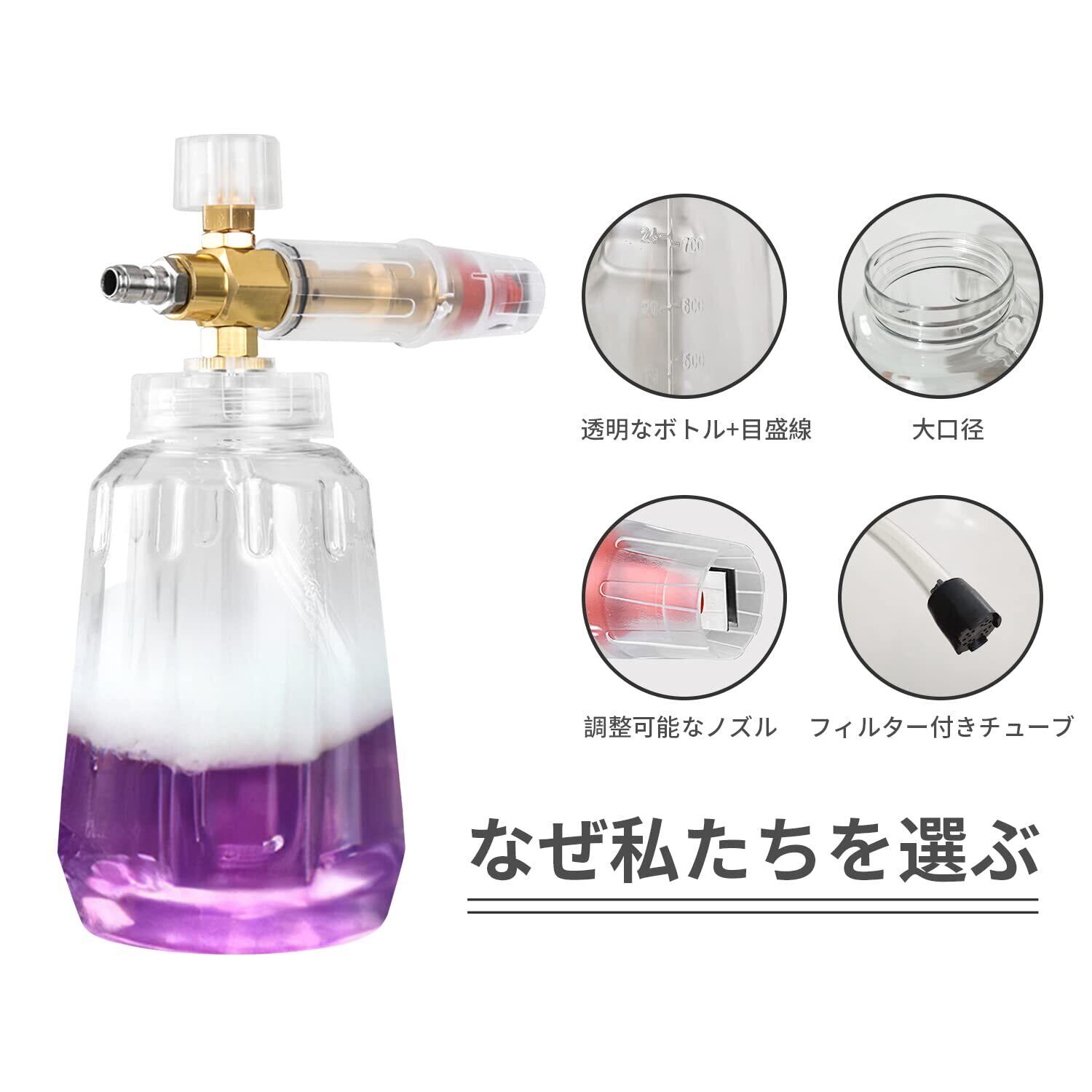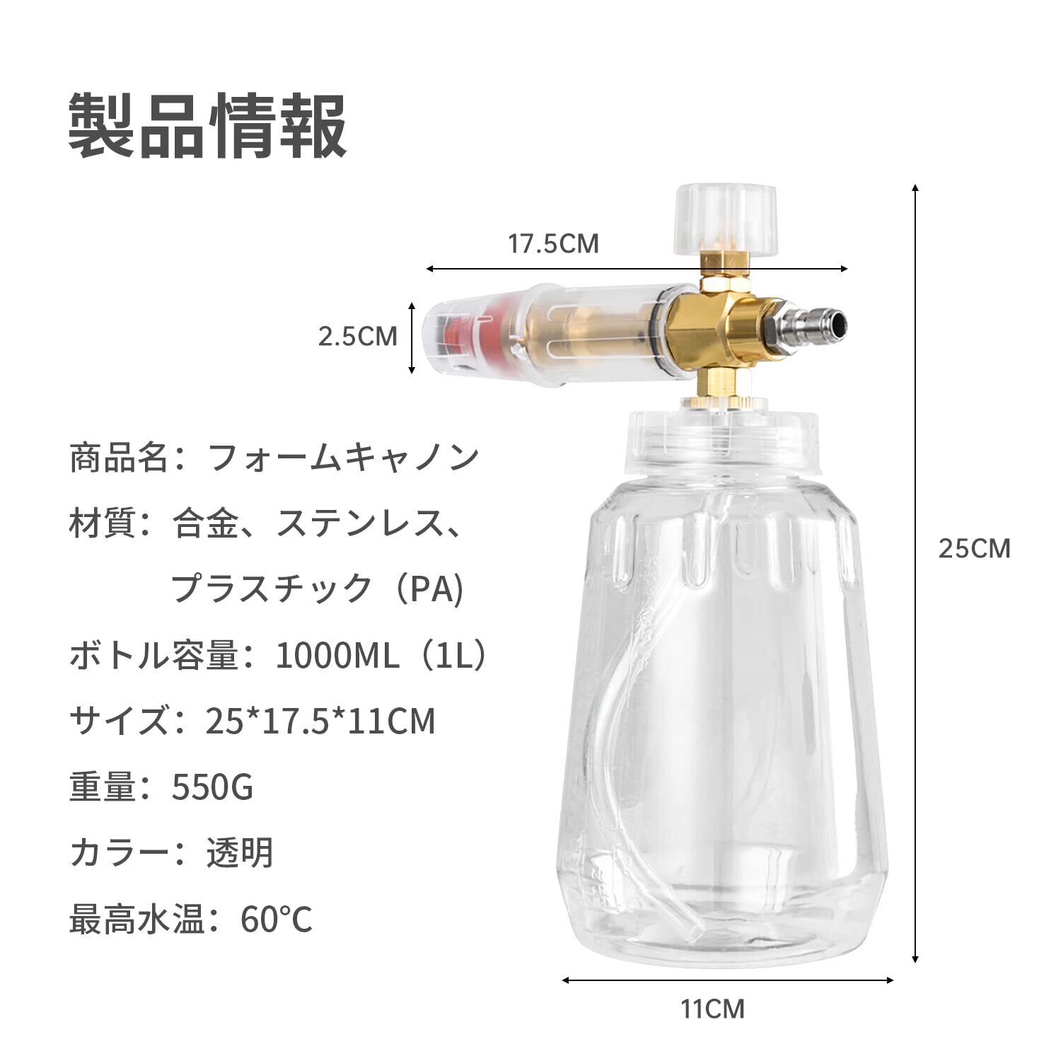 【素材】合金、ステンレス、プラスチック;ボトル容量:1000ml(1L);最高水温:60℃。内容:フォームランスボトル、接続アダプター、吸引式チューブ。精密に製造された金属製インジェクターは、石鹸の混合比率が少なく、豊富で高密度のフォームをします。目盛線付きの透明なポット本体は、ボトル内の液体がはっきりと見え、いつでもどこでもボトル内の液体容量が分かります。