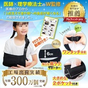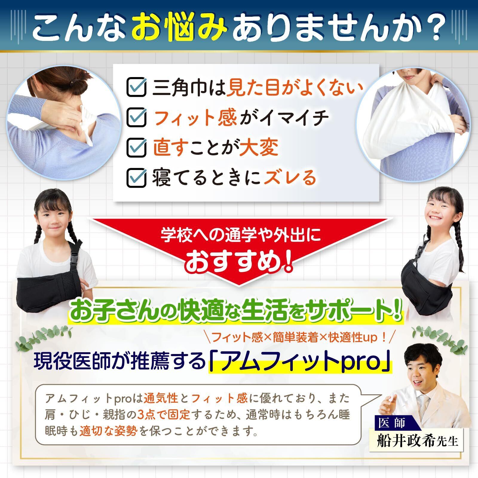 【元気いっぱいのお子さまにピッタリ!3点支えでバランス抜群!一日中、肩楽々】肩・ひじ・親指の3点で腕を支える〈3点支持構造〉で、ずっと快適!「三角巾で腕を吊ると首や肩が痛くてツラい‥。」患者さまの声から生まれた『アムフィットpro』。三角巾とは桁違いの疲れにくさ!①幅広な肩サポーター×②親指ホルダー×③ひじにフィットするやさしいガーゼ素材を採用し、さらに快適性がアップしました。