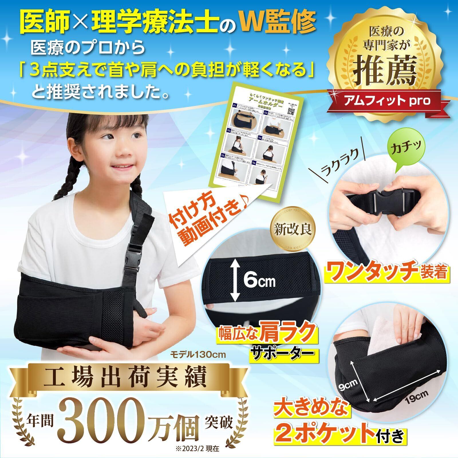 【こだわりポイント!】《ポイント①:新改良の肩サポーター》6㎝の幅広バンド、厚みのあるクッションで肩にやさしい。《ポイント②:親指ホルダー》腕のすべり落ちを防止する親指ホルダー(フック)付きで安定感抜群です。《ポイント③:ポケットは内外2箇所》2つの大きめポケット付き。大切な物をいつでもそばに!小物・ハンカチなど、スマートに収納できて重宝します。左右どちらに装着しても使える(左右兼用)。(※ポケットサイズ:縦9×横19㎝)。《ポイント④:通学時も目立ちにくいシンプル・ブラック》“三角巾だと気になる汚れ” 『アムフィットpro』なら、シンプルな黒色なので汚れが目立ちにくく、通学や外出時など、どんな服装にも合わせやすいです。《ポイント⑤:丸洗いOK》汚れてもサッと水洗い!速乾性に優れ、お手入れ簡単いつでも清潔を保てます!