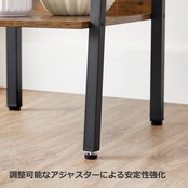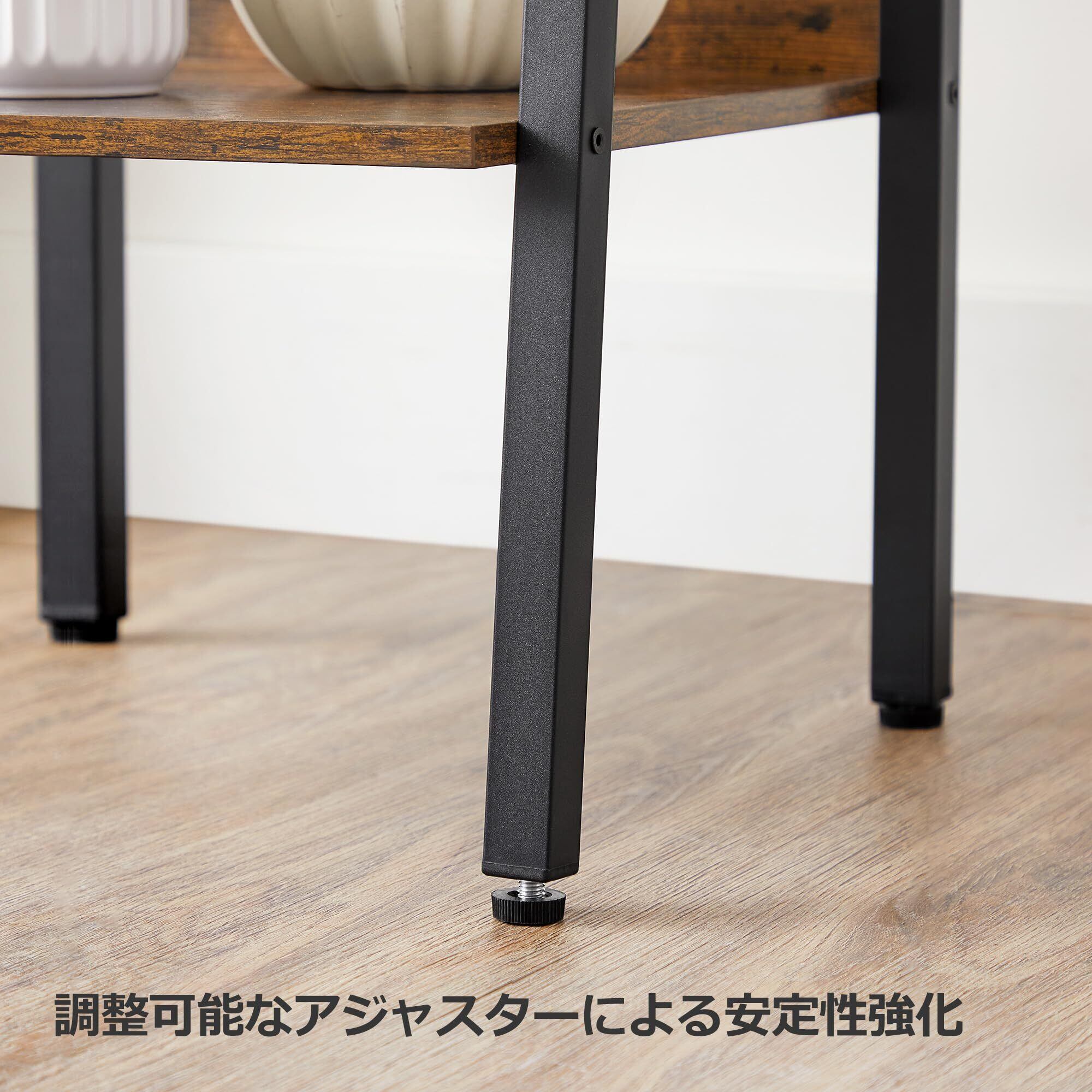 【頑丈なフレーム】細身の金属製骨組みは安定感があり、上段に行くほど奥行が狭くなる構造は、どんな角度からみてもおしゃれです。更に底部にはキャップが設けられ、安定さを保つだけでなく、床も傷から保護できます
