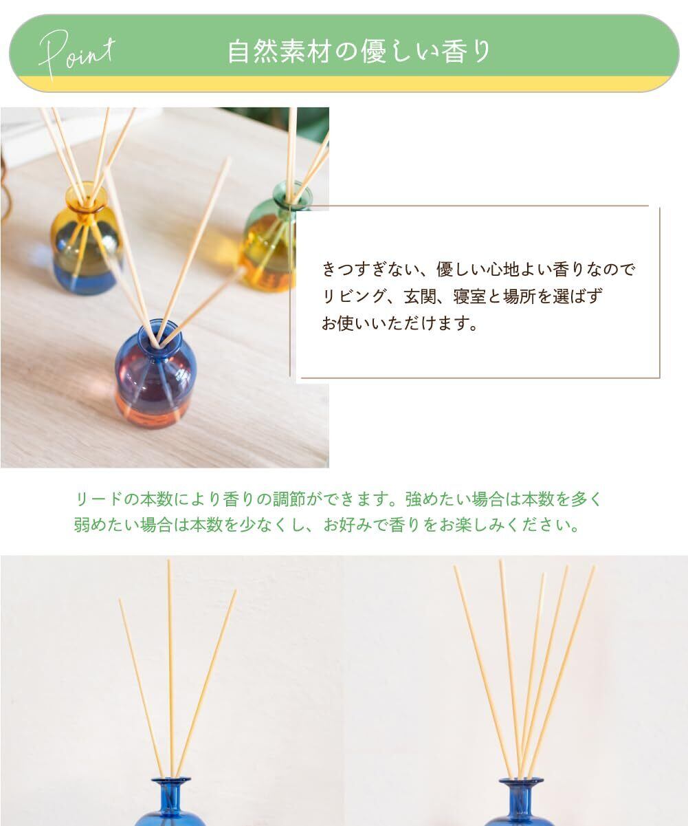『香りを好みで調節』リードは6本付属。本数により香りの調節ができます。強めたい場合は本数を多くし、弱めたい場合は本数を少なくし、お好みで香りをお楽しみください。