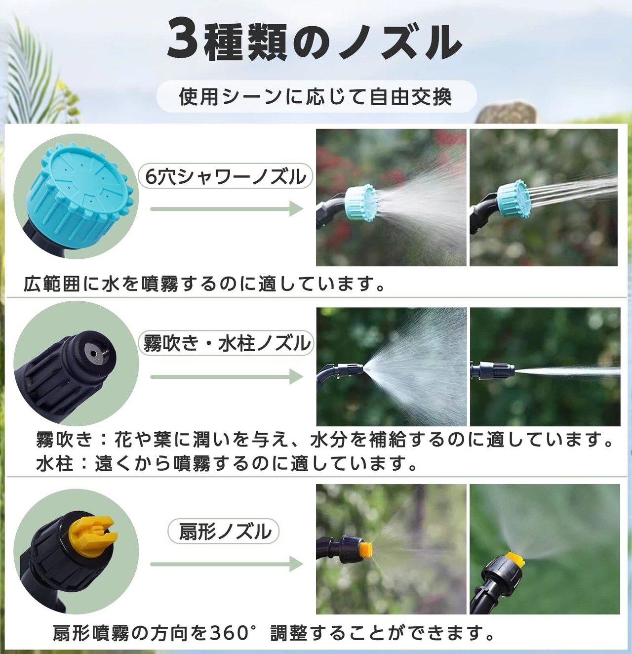 【3種類のノズルを用意】本製品には3種類のノズルが用意されており、自由に交換することができます。【ノズル1:霧吹き・水柱ノズル】霧吹き:花や葉に潤いを与え、水分を補給するのに適しています。水柱:遠くから噴霧するのに適しています。【ノズル2:6穴シャワーノズル】広範囲に水を噴霧するのに適しています。【ノズル3:扇形ノズル】扇形噴霧の方向を360°調整することができます。