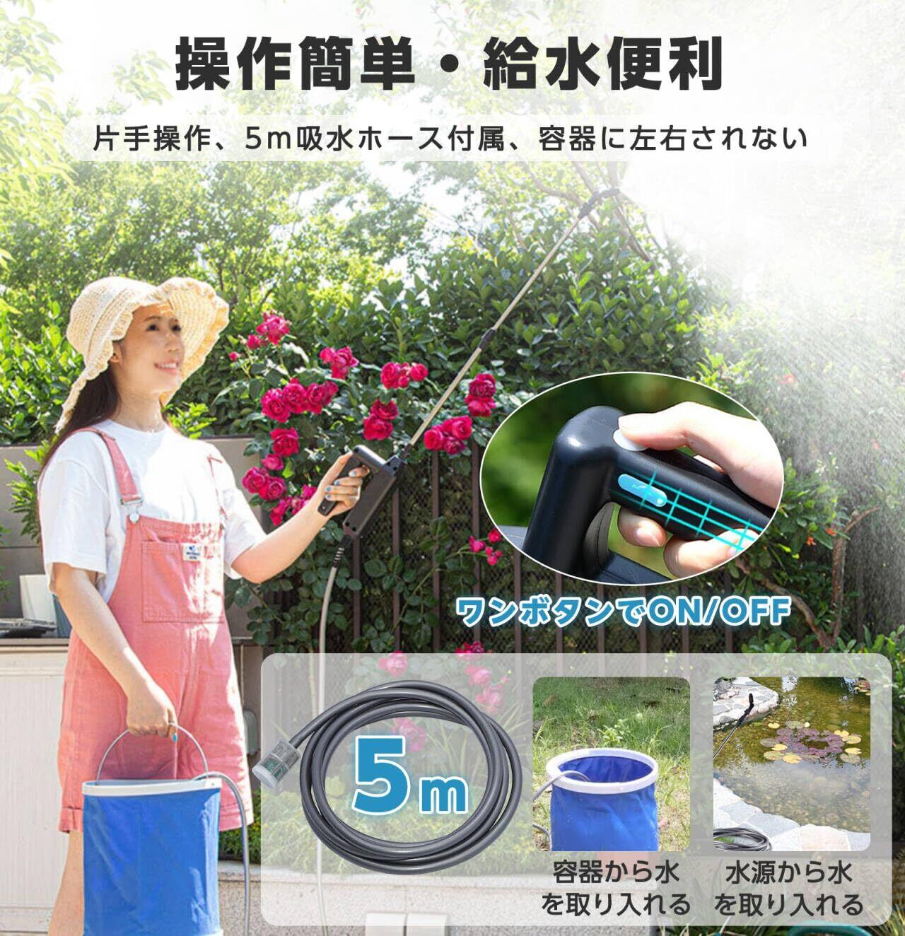 【軽量で持ち運びに便利】本体+スプレーバーは約335gと軽量なので、片手で長時間使っても疲れることがなく、簡単に噴霧を行うことができます。容器に左右されない5m吸水ホースが付属しています。水源や容器から直接水を取り入れることができるので、融通性があって便利です。