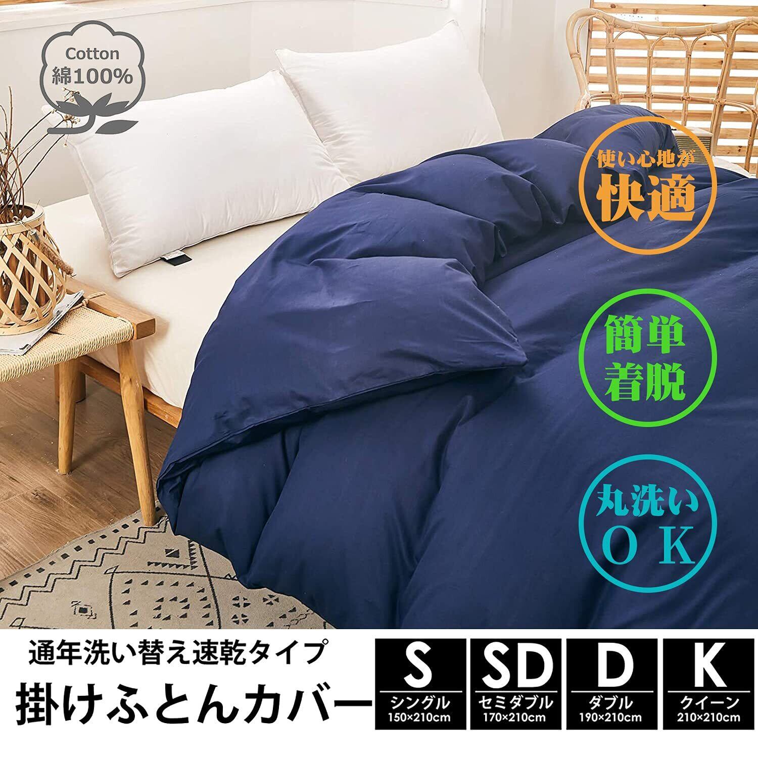 掛け布団カバー 布団カバー 綿100% ふとんカバー 掛けカバー 洗える 抗菌防臭 防ダニ オールシーズン ピーチスキン加工 全開ファスナー 通気 速乾 単品 (通年タイプ・ネイビー, シングル・150X210cm)