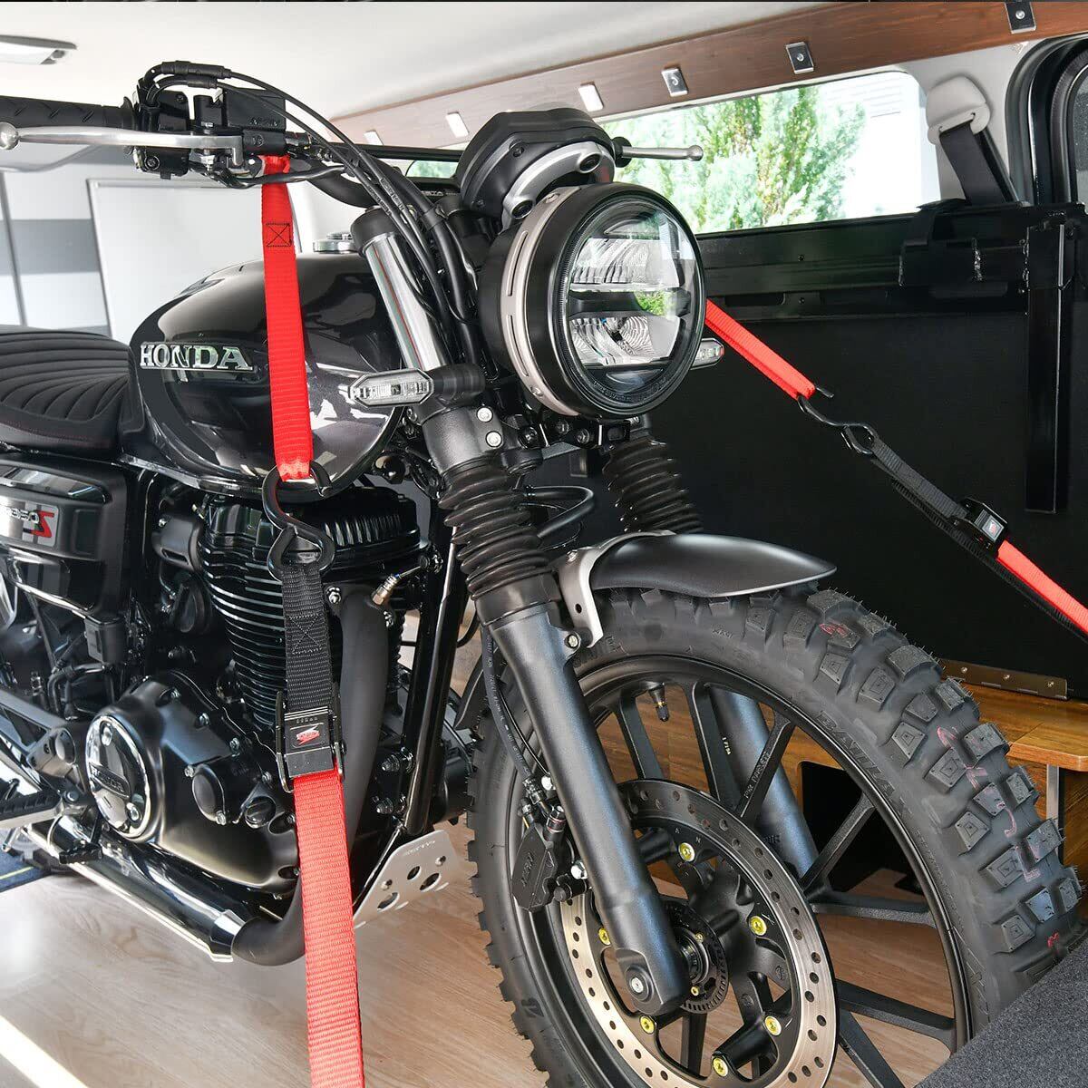 ベルトの広い面で引っ張れるため、車体へのダメージを軽減。ハンドルなどにタイダウンフックを直接掛けてしまうと、その一点が凹んでしまい、最悪走行時にそこから折れてしまう事もある。
