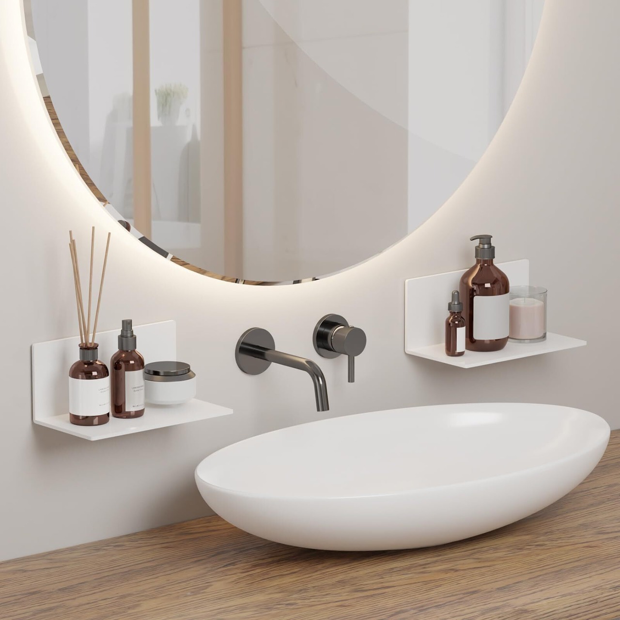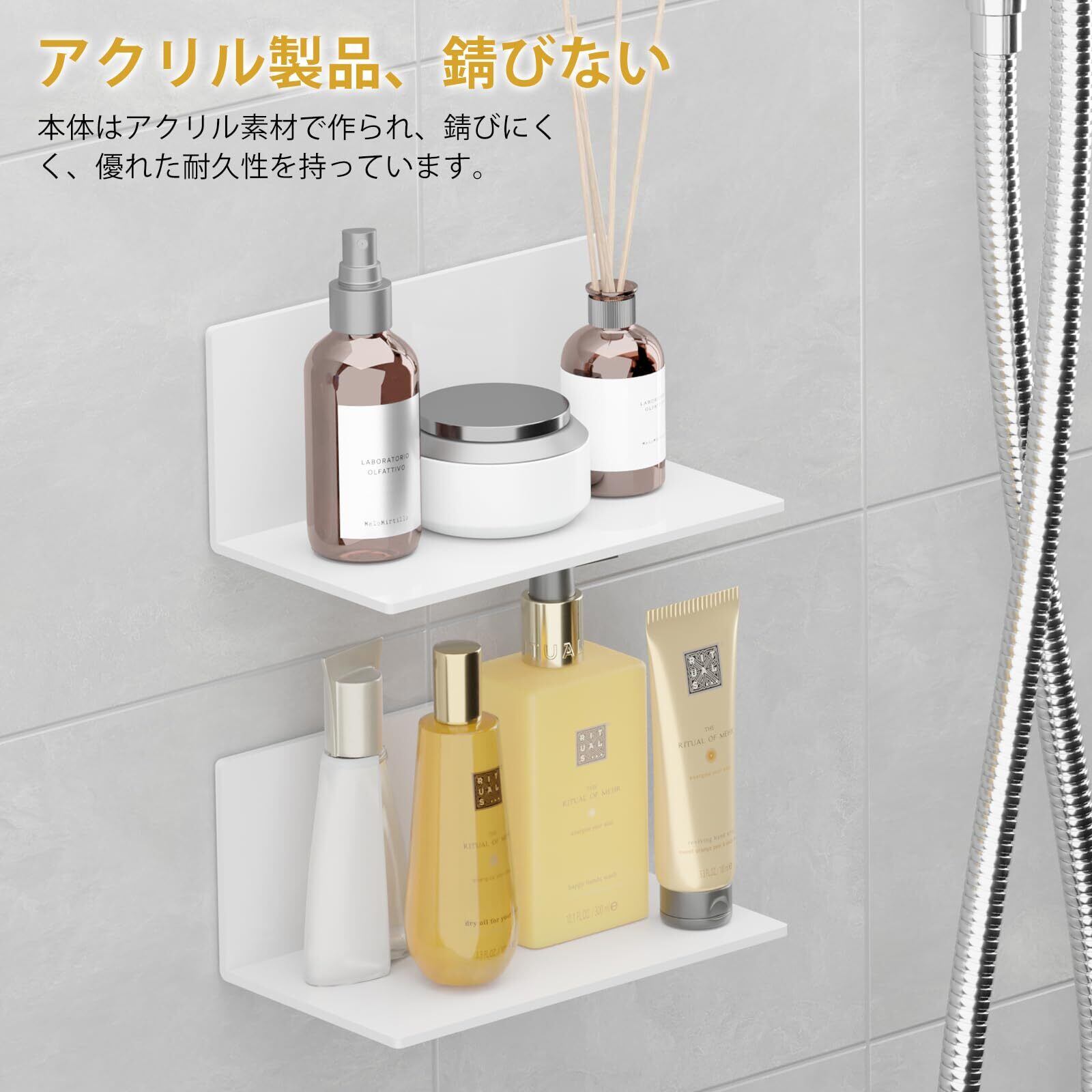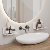 【浮かせる収納】綺麗に収納しながら限られたスペースを有効活用できます。手軽に収納スペースを増やせる物を置く場所に困る狭いユニットにおすすめです。 場所を取らず、浮かせて収納できます。(壁が汚れていると十分な接着力が得られない場合がございますので、取り付け前に汚れを落とし一度乾かして設置してください。)