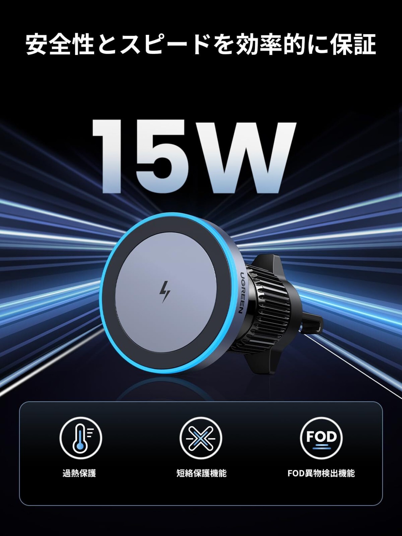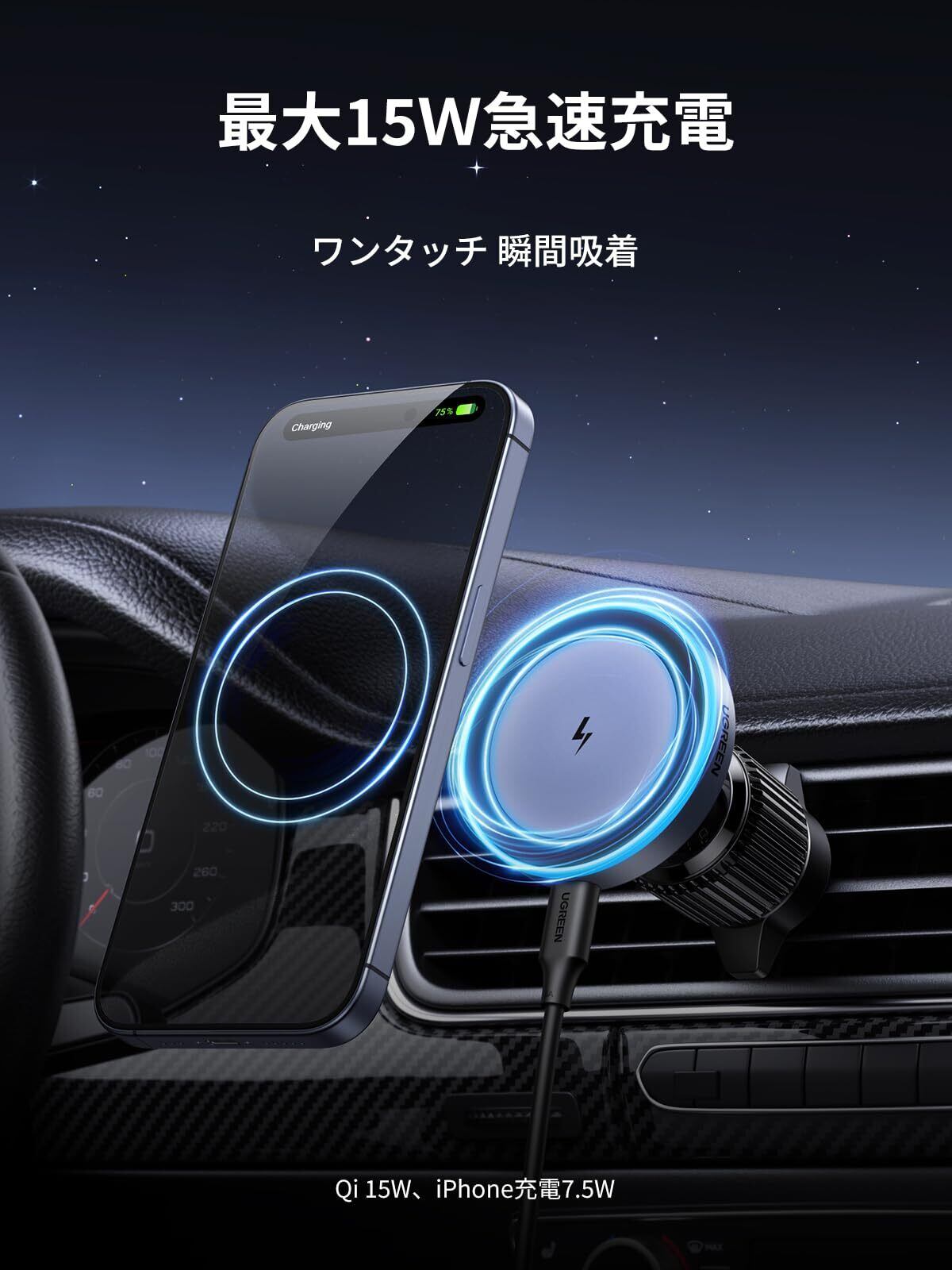 【特価商品】UGREEN MagFlow MagSafeワイヤレス車充電器 Qi 15W LEDライト付き 360度回転 車載携帯電話ホルダー iphone 17/16/15/14/13/13/12シリーズに対応 | ニコニコSHOP