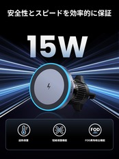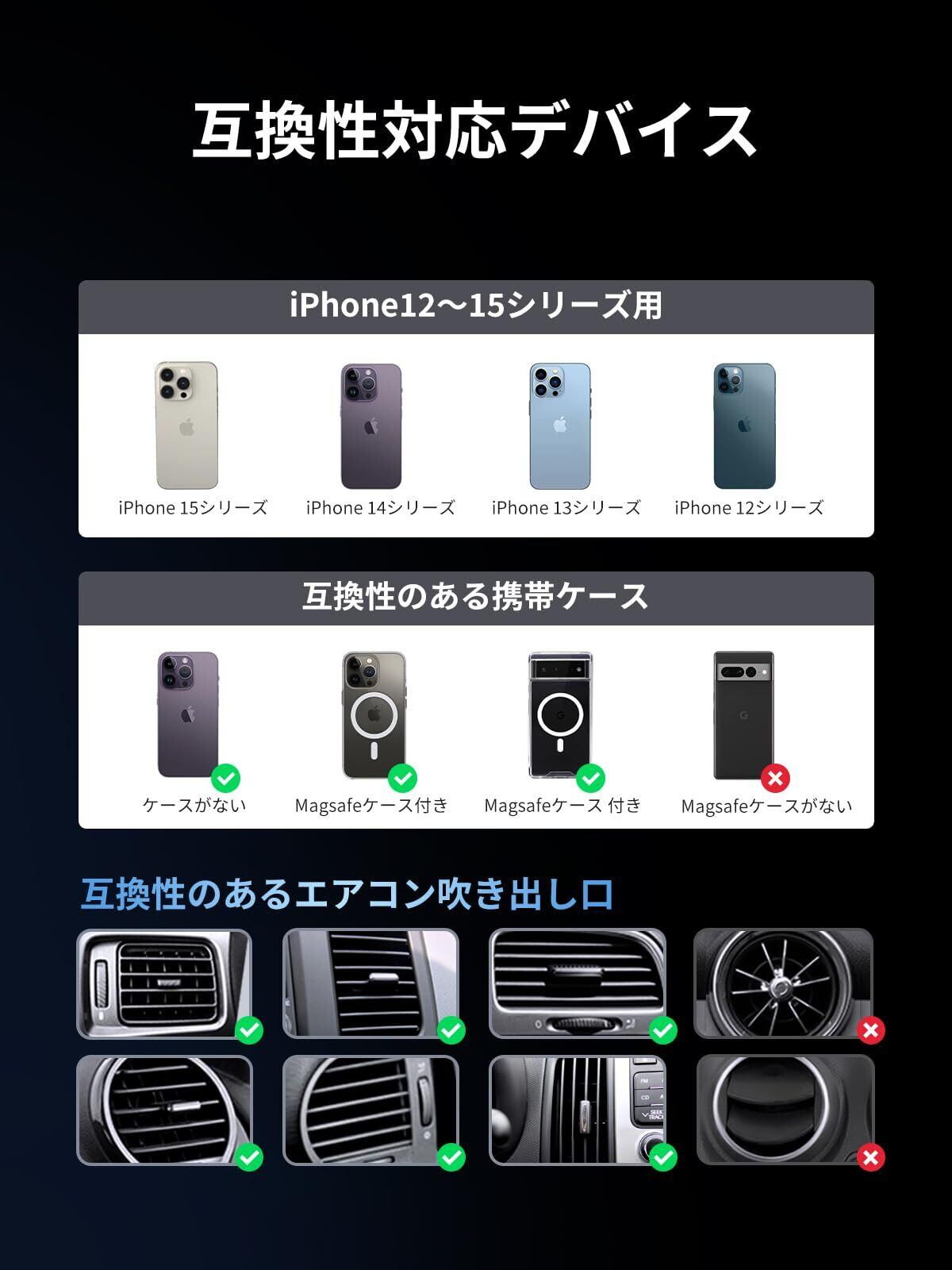 iPhoneシリーズのために設計:MagSafeワイヤレス車充電器はiPhone 16/iPhone 15/iPhone 15 Plus/15 Pro/15 Pro Max/14/14 Pro/14 Plus/14 Pro Max/13/13 Pro/13 Pro Max/13 Mini/12/12 Pro/12 Pro Max/12 Miniなどに対応します。より良い使い心地のために、携帯電話ケースを使用する場合は、必ずアップル社またはアップル社認定のMagSafe携帯電話ケースを使用してください。