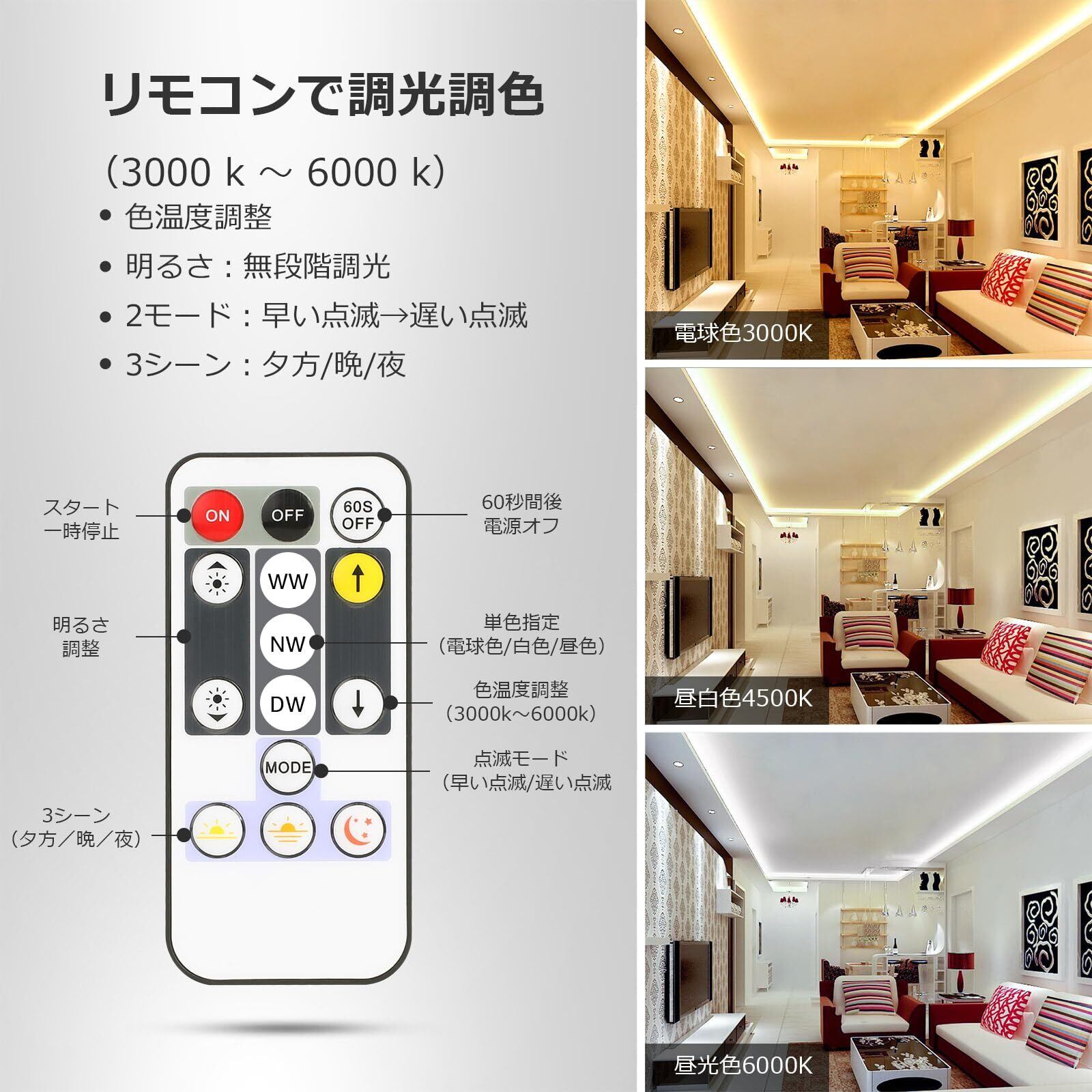 【リモコンで調光調色(電球色・昼白色・昼光色)】幅広く細やかな色温度3000k~6500kまで調整が行えます。完全な白はもちろん、 白よりの電球色や微妙な昼白色、昼光色、温白色も鮮明に実現可能!(ご注意:初使用時、リモコンの絶縁シートを取り外して操作してください。)