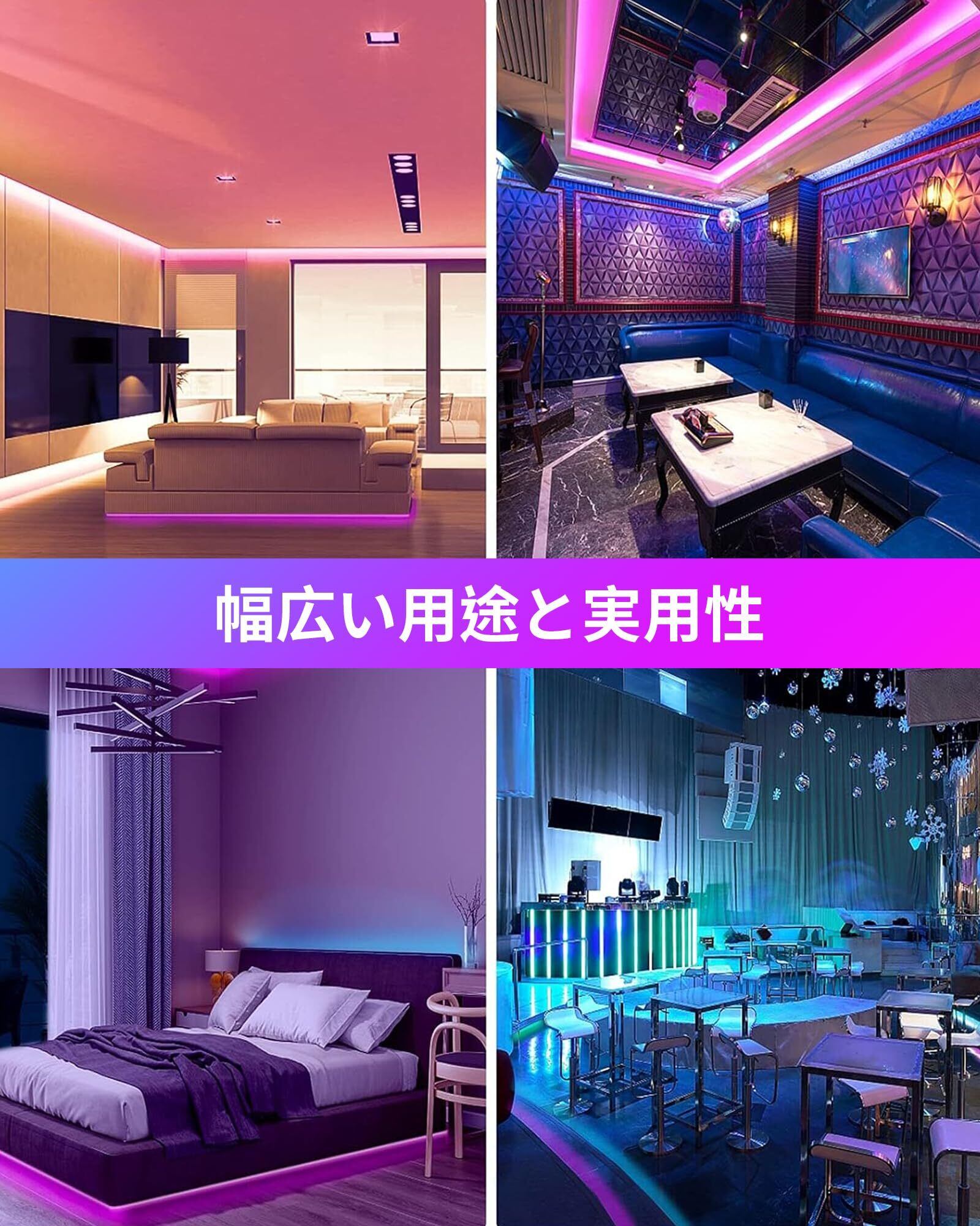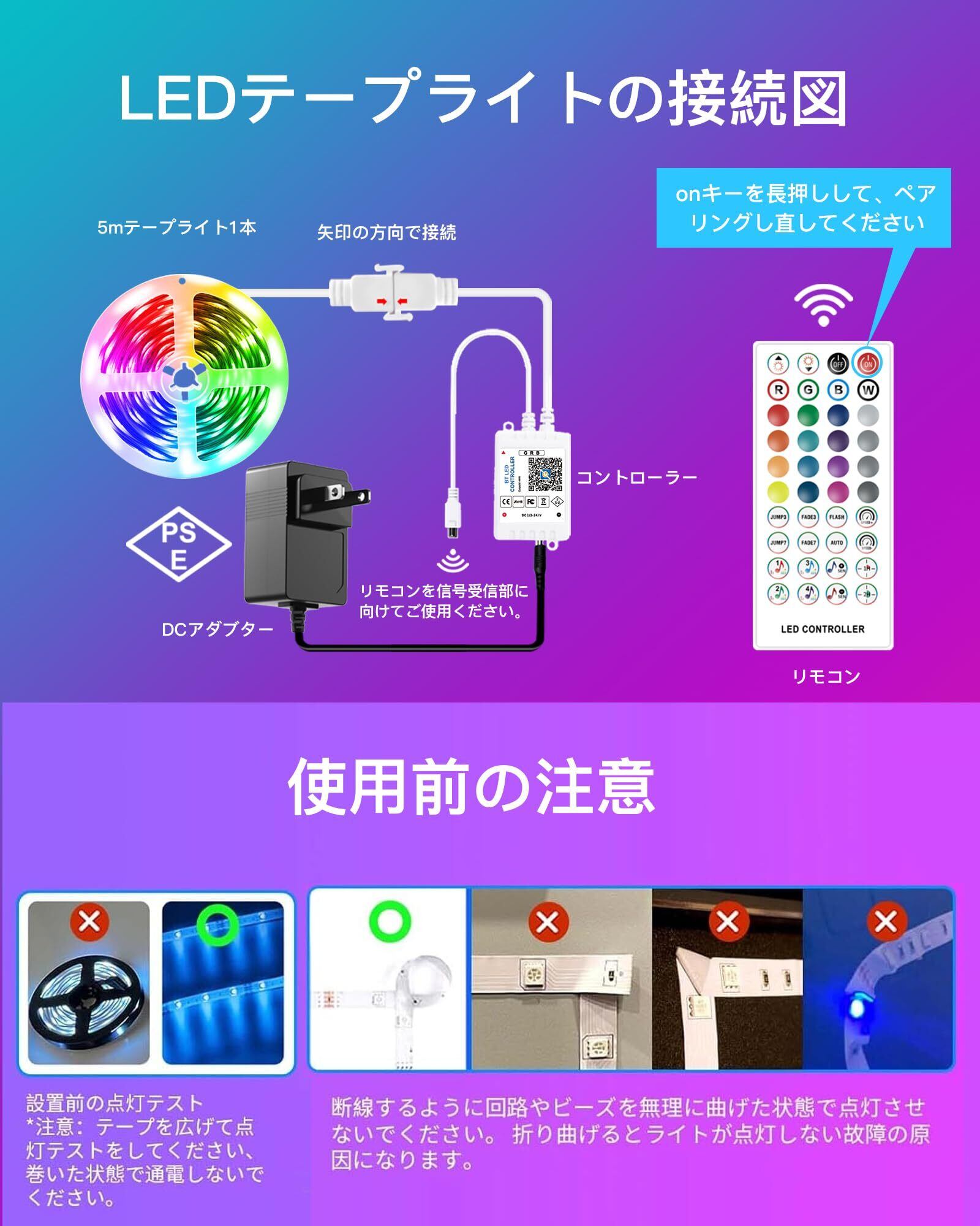 【安全な素材、幅広い用、強い雰囲気】LEDテープはPES認証に合格しており、安心して使用できます。 100V~240Vの電圧に対応し、日本だけでなく海外でも使用できます。RGB LEDテープライトは室内間接照明として使用でき、家庭、寝室、壁、天井、ショーケース、階段、棚、玄関、およびKTV、バー、文字板、活動場所、会所、休憩室などの多種多様な場所に使用される